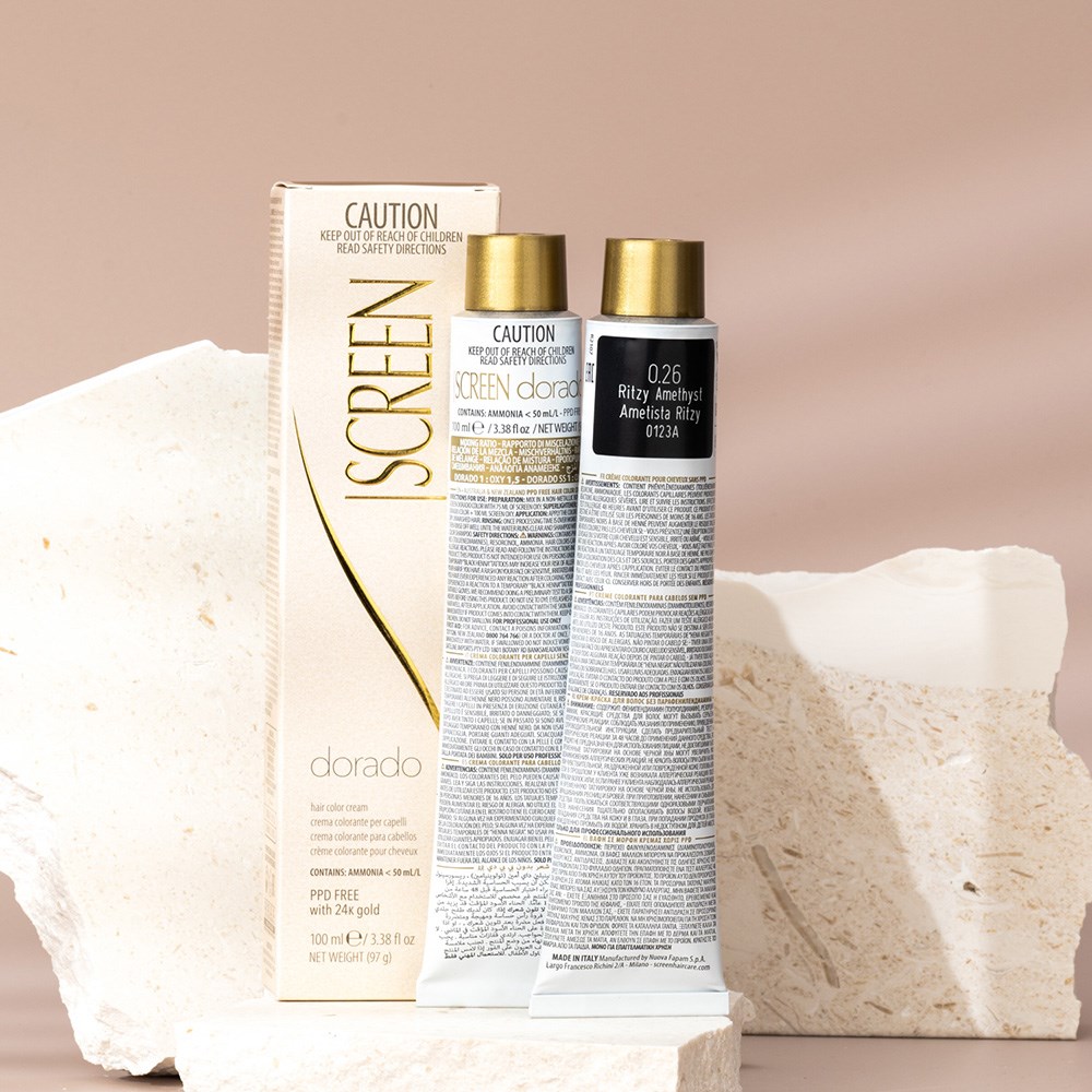 Inspired by the changing colours of the Grand Canyon over the course of the day, Screen has created the beautiful Colorado Twinkle collection. Screen Dorado Hair Colour Toner 0.26 Ritzy Amethyst is a precious hair cream with unique tonal richness. This hair colouring cream is PPD-free and enriched with 24K gold for results which are truly incredible. Microparticles of gold reflect light, multiplying the brilliance of colour. Colour is for toning and does not affect the base colour. Ethereal and sophisticated colour created in Italy.
