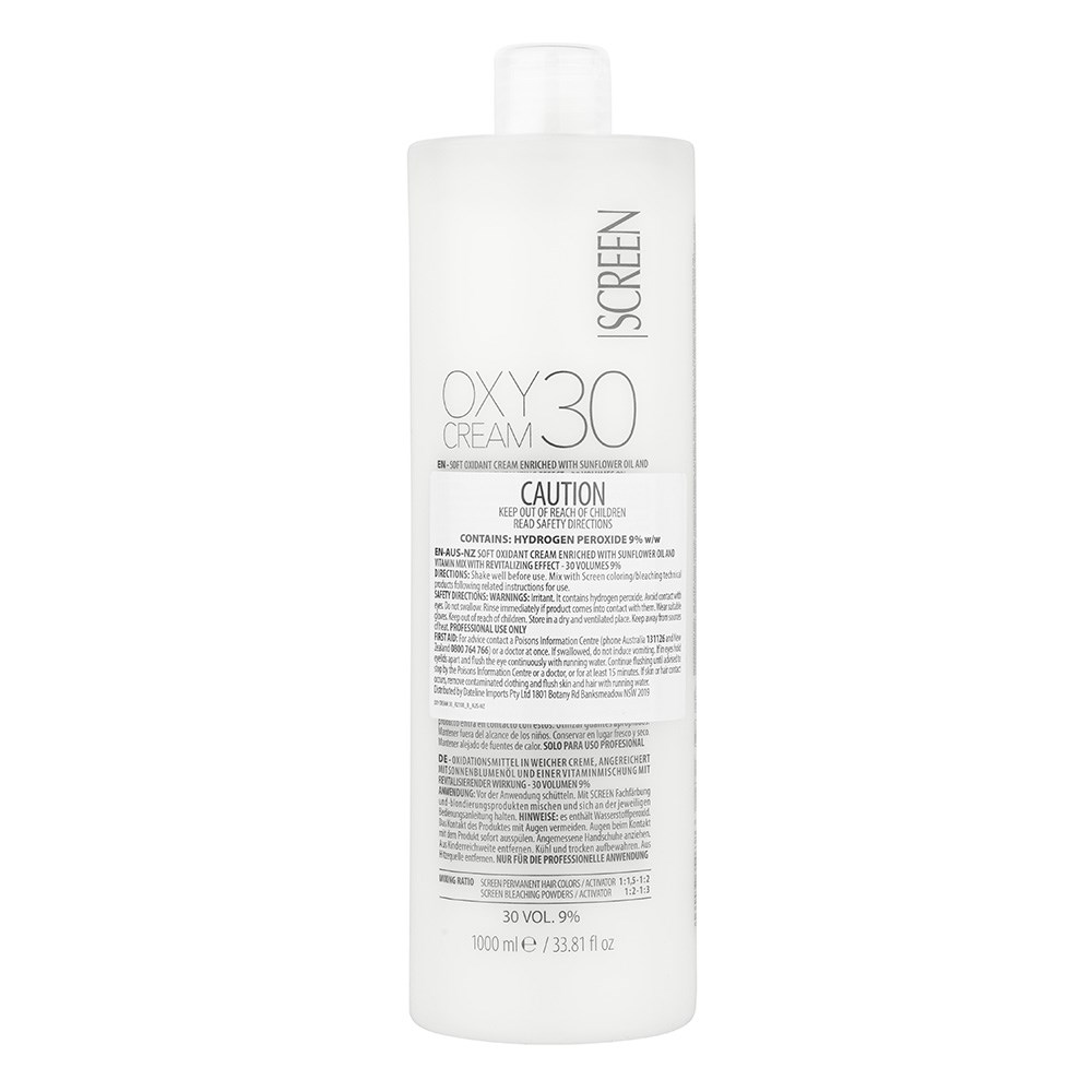 Screen Oxy Cream 30 Volume Activator is a soft oxidant cream enriched with sunflower oil and precious antioxidants. Nourishing, moisturising and protective, this special creamy formula is soothing and gives maximum protection to skin during treatments. Easy to mix texture ensures the stability of colour. Mix with Screen’s elite colouring and bleaching range for outstandingly beautiful results while maintaining hair’s integrity.
