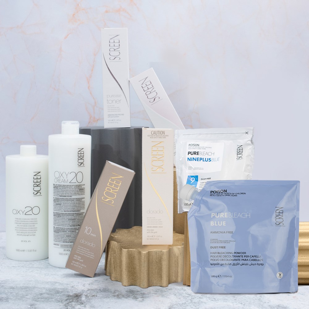 An elite hair product range with a vision to defy norms. Made in Italy, Screen has swept across 68 countries, championed by hair artists who love the advanced ingredients and gorgeous results. Expect outstanding performance from Screen Pure Ammonia Free Hair Bleach Blue. With an innovative ammonia-free formula, this dust-free, non-volatile bleaching powder counteracts yellow and orange tones. Easy to mix while offering maximum control over the lightening process.