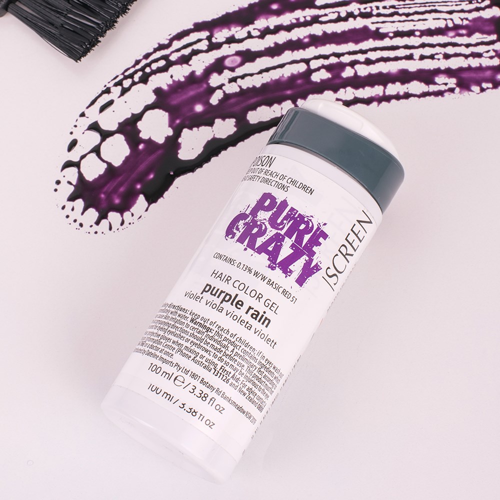 Transform hair into the most fashionable accessory. Screen Hair Care Pure Crazy Colour Gel Purple Rain is a pure expression of creativity. Give life to vibrant and original colours without commitment, bleaching or stressing hair. Formulated by professionals, this hair colour gel conditioner adds temporary colour and conditions at the same time. Great for those who love to play – test your creativity with intermixable shades for infinite possibilities! From pastel to vivid, this is high quality, professional temporary colour made crazy fun.