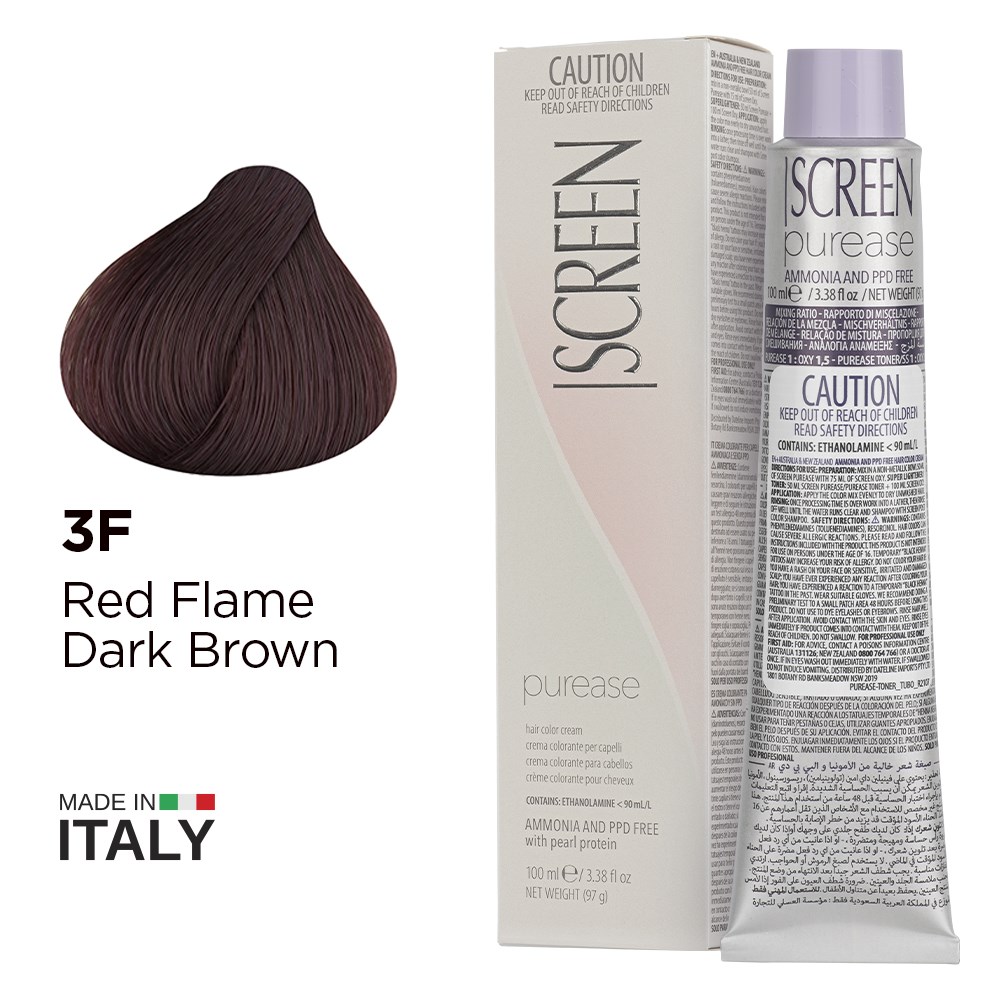 Created from the most advanced research, Screen Purease Hair Colour Cream 3F Red Flame Dark Brown is PPD-free and ammonia-free colouring cream enriched with strengthening pearl protein. Easy and quick application, a nuanced collection of hues and precious ingredients for brilliant shine make Screen Purease Hair Colour Cream a complete colouring system, suitable for satisfying the most creative of desires. Maximum grey coverage, long-lasting and outstandingly uniform results. Elite colour made in Italy.