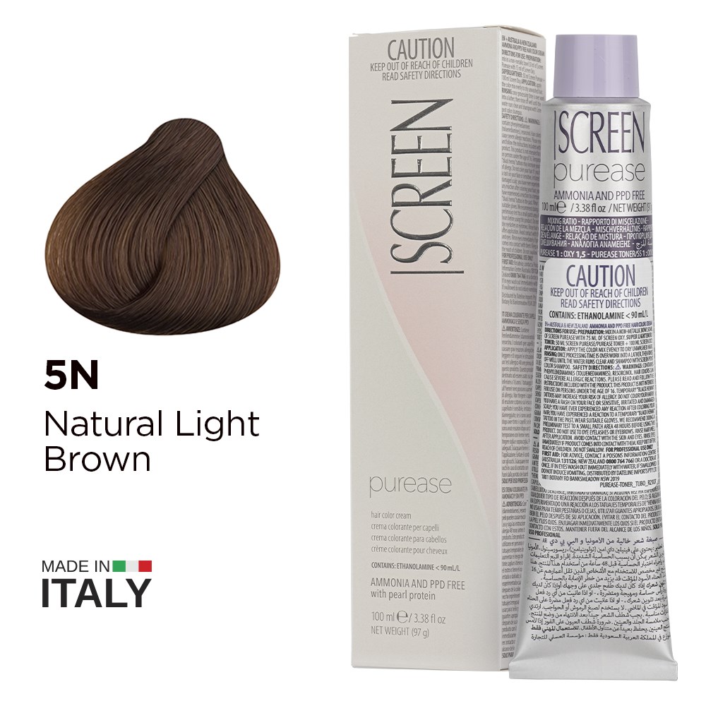 Created from the most advanced research, Screen Purease Hair Colour Cream 5N Natural Light Brown is PPD-free and ammonia-free colouring cream enriched with strengthening pearl protein. Easy and quick application, a nuanced collection of hues and precious ingredients for brilliant shine make Screen Purease Hair Colour Cream a complete colouring system, suitable for satisfying the most creative of desires. Maximum grey coverage, long-lasting and outstandingly uniform results. Elite colour made in Italy.