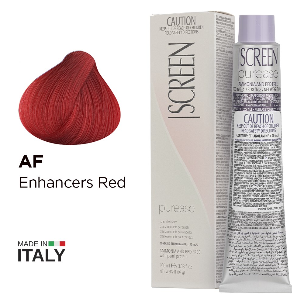 Created from the most advanced research, Screen Purease Hair Colour Cream AF Enhancers Red is PPD-free and ammonia-free colouring cream enriched with strengthening pearl protein. Easy and quick application, a nuanced collection of hues and precious ingredients for brilliant shine make Screen Purease Hair Colour Cream a complete colouring system, suitable for satisfying the most creative of desires. Maximum grey coverage, long-lasting and outstandingly uniform results. Elite colour made in Italy.
