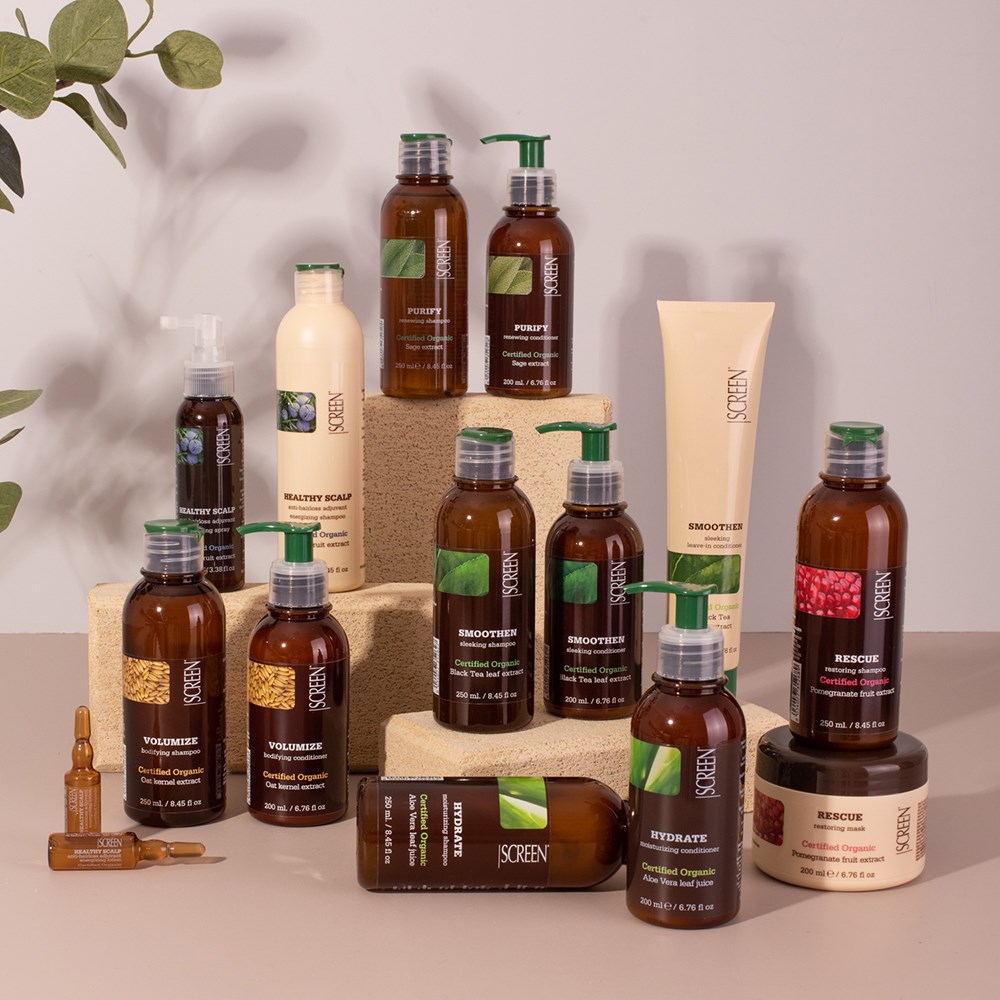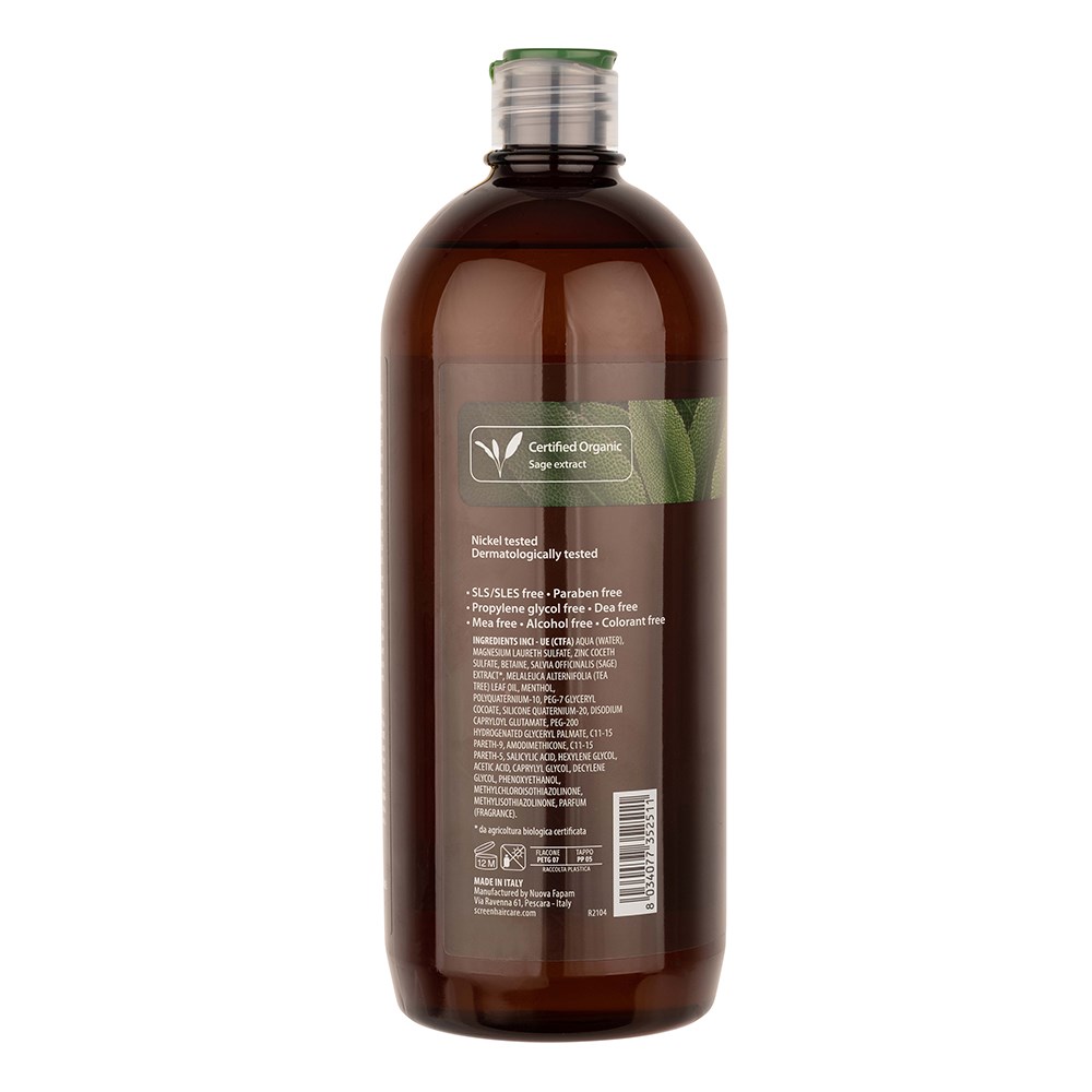 Organic ingredients for the maximum expression of purity. Screen Purest Purify Renewing Shampoo 1L is clean beauty made in Italy. Formulated with certified organic sage extract, this purifying shampoo gently nourishes and deeply cleanses scalp and hair. Sage extract is known for its purifying power, as well as its refreshing scent. SLS-free and paraben-free, this renewing shampoo is suitable for daily use. Naturally derived, non-genetically modified ingredients in a colourant-free formula for vitality and shine renewal.