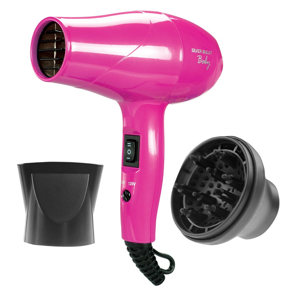 Silver Bullet Baby Travel Hair Dryer is a teeny tiny hair dryer with almighty power. This incredibly compact, light and travel-friendly hair dryer has a powerful airflow and 2 speed/heat settings for every hair type. Dual voltage for worldwide use, the Silver Bullet Baby Travel Hair Dryer is a styling superstar for on the go.