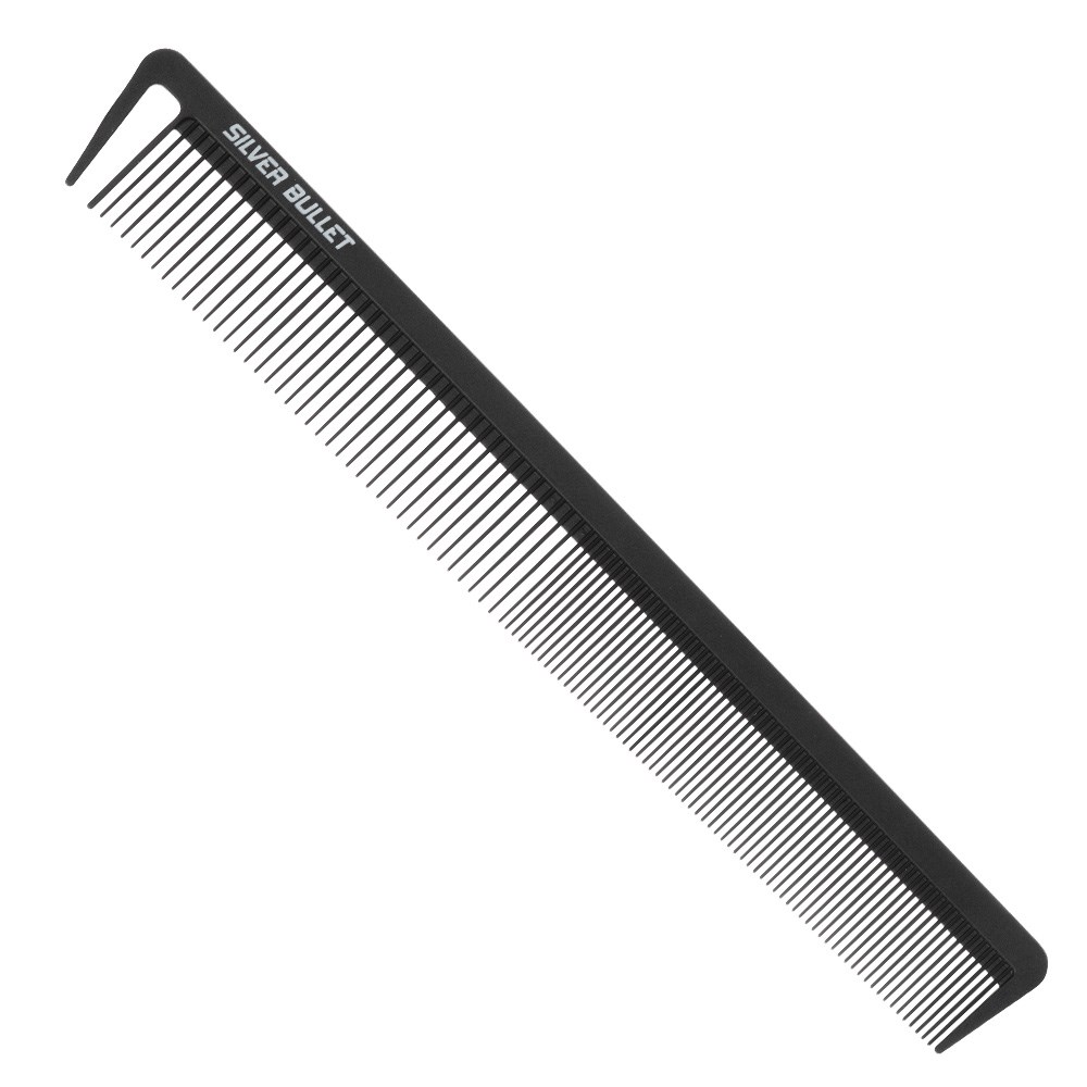 Silver Bullet Carbon. Strong. Resistant. Super-smooth. Silver Bullet Carbon Cutting Comb is made from carbon fibre and unconditionally guaranteed against breakage. Super-smooth teeth effortlessly glide through all hair types. Heat resistant and perfect for blow-drying. Ideal for use with chemicals. This 22.7cm comb features a dual teeth design for versatility in cutting different hair types and textures.