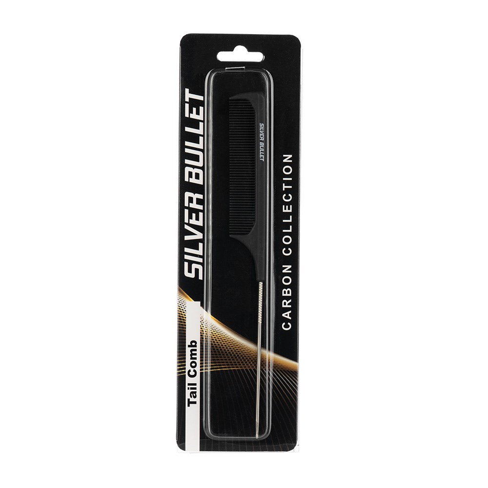 Silver Bullet Carbon. Strong. Resistant. Super-smooth. Silver Bullet Carbon Metal Tail Comb is made from carbon fibre and unconditionally guaranteed against breakage. Super-smooth teeth effortlessly glide through all hair types. Heat resistant. Ideal for use with chemicals. This 22.1cm comb is best suited to precision styling, parting and sectioning hair. The metal pin tail is durable and long-lasting. Use during foiling and highlighting or for creating updos and braiding.
