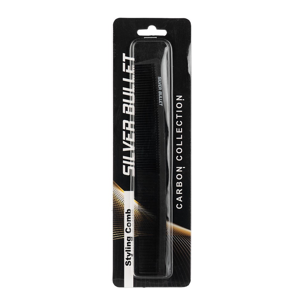 Silver Bullet Carbon. Strong. Resistant. Super-smooth. Silver Bullet Carbon Styling Comb is made from carbon fibre and unconditionally guaranteed against breakage. Super-smooth teeth effortlessly glide through all hair types. Heat resistant and perfect for blow-drying. Ideal for use with chemicals. This 22.2cm comb with a variety of teeth spacing is a versatile tool for detangling, sectioning and creating various hairstyles.