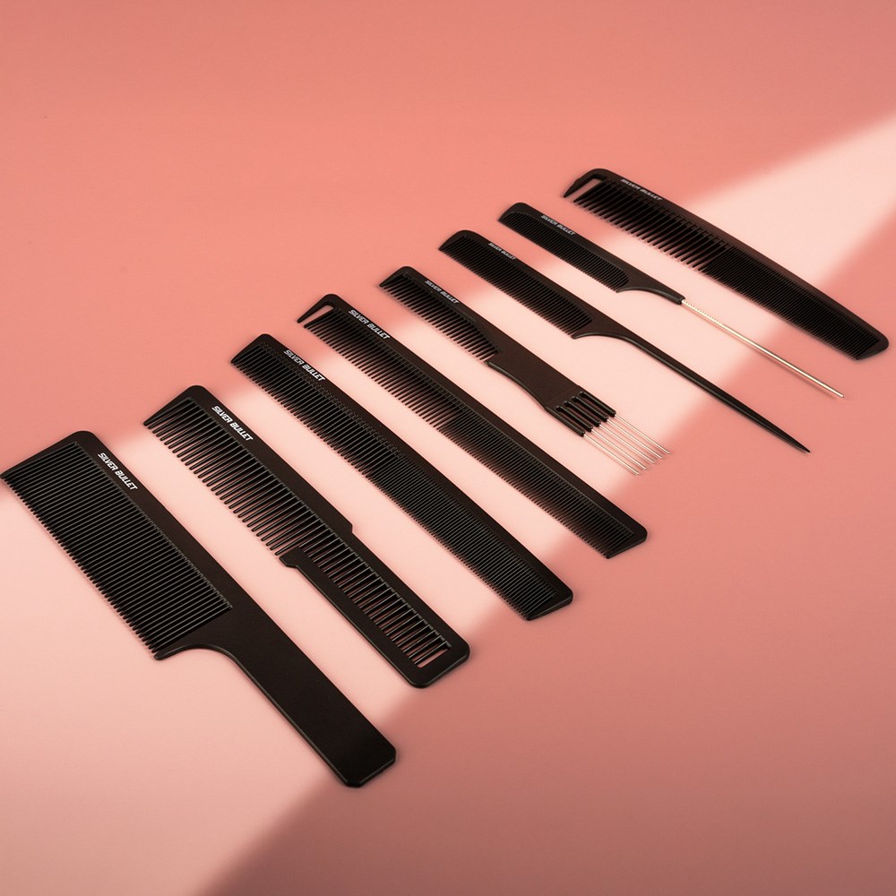 Silver Bullet Carbon. Strong. Resistant. Super-smooth. Silver Bullet Carbon Tail Comb is made from carbon fibre and unconditionally guaranteed against breakage. Super-smooth teeth effortlessly glide through all hair types. Heat resistant and perfect for blow-drying. Ideal for use with chemicals. This 23.8cm comb is excellent for parting and sectioning during blow-drying, curling and straightening. Plastic pin tail provides gentler sectioning without scratching the scalp.