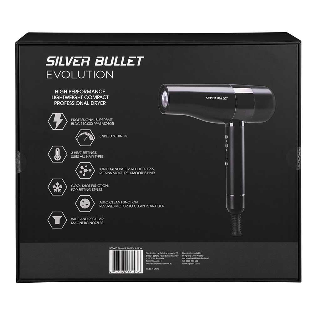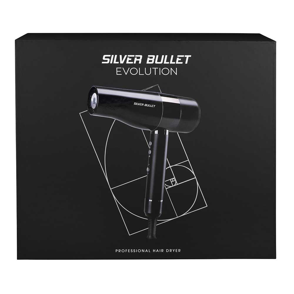 The Evolution is here. Ultra-high performance, lightweight and compact. Silver Bullet Evolution Professional Hair Dryer is the humble hair dryer made extraordinary. Exceptional power and speed with a super-fast BLDC 110,000 rpm motor. Blow-dry faster and better than ever before. 3 speed and 3 heat settings for all hair types. Clever auto clean function reverses motor to clean rear filter. Includes two magnetic nozzles: wide and regular.