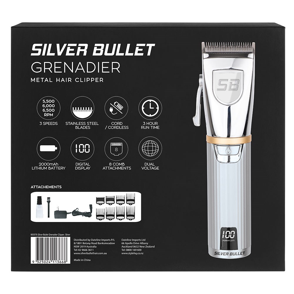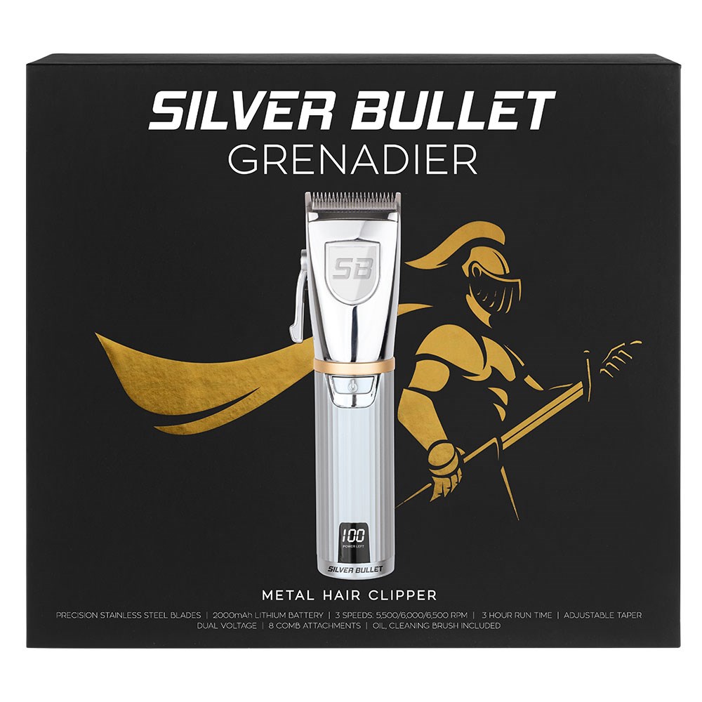 Elite performance in shining armour. Silver Bullet Grenadier Metal Hair Clipper Silver is an outstanding salon clipper for all hair types. This is a retro metal clipper with cutting edge features, including multiple speed settings up to 6,500 rpm to suit every client’s needs. Stainless steel blades for impeccable precision and all-day usage without overheating. 2,000 mAh lithium battery for 3 hours cordless runtime without compromise. Adjustable taper, 8 comb attachments and a digital display. Precision without the price tag, Silver Bullet Grenadier Metal Hair Clipper awaits your command.