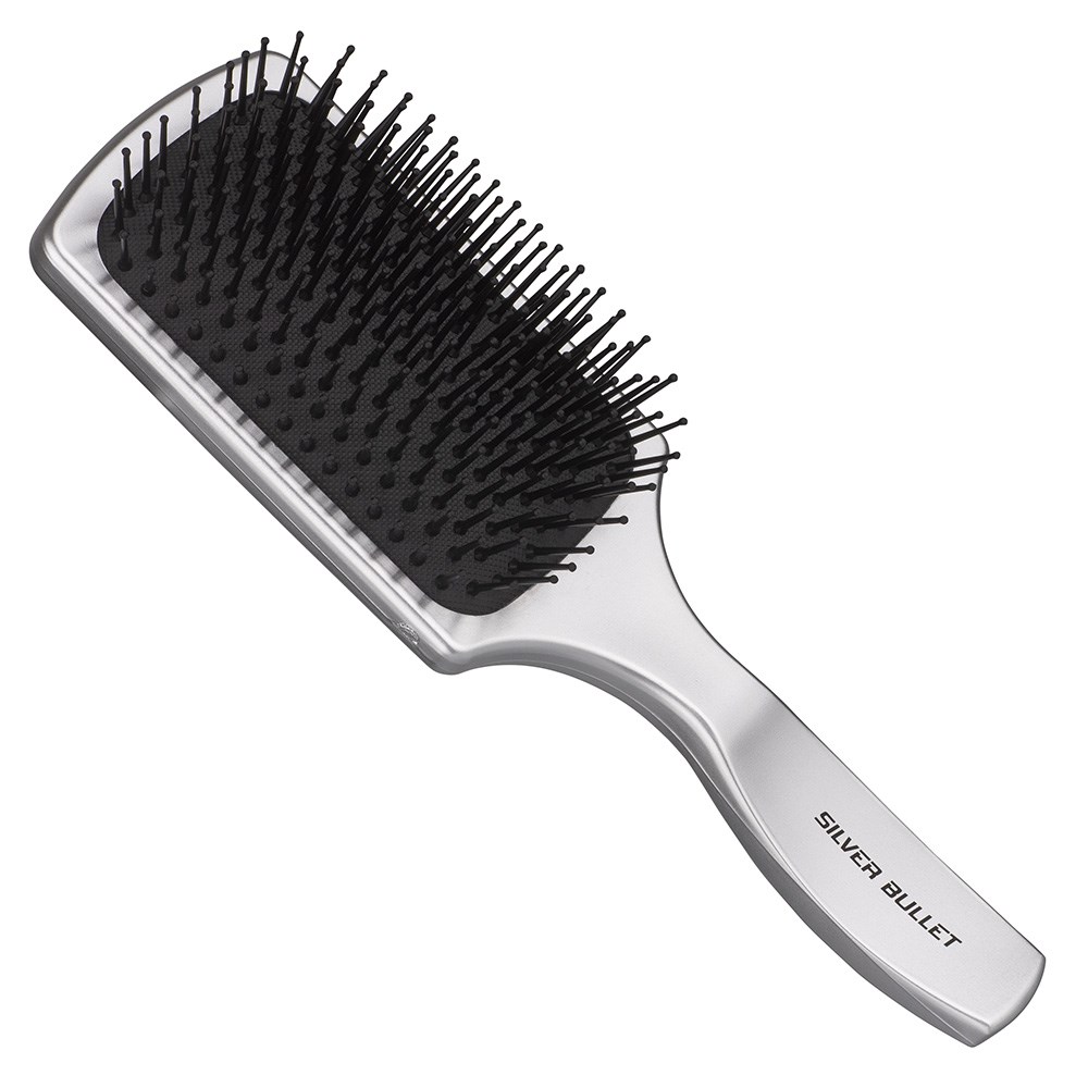 This is the quintessential paddle brush. Silver Bullet Nylon Pin Paddle Hair Brush Large is perfect for all hair types, including the longest and thickest of manes. This classic paddle hair brush features a rubber cushioned pad and flexible nylon bristles with gentle ball tips. Designed for easy brushing out, smoothing, detangling dry hair, adding shine and removing product build-up. Kind yet effective, the larger surface area results in faster brushing.