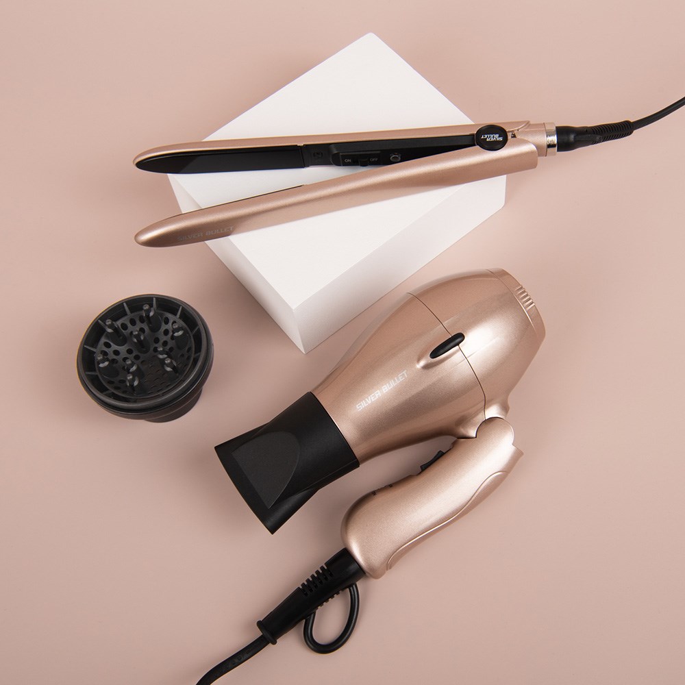 Ready, set, go! Professional styling on-the-go with Silver Bullet Styleaway Hair Dryer and Straightener Travel Set. Silver Bullet Runway Foldable Mini Travel Hair Dryer packs power with 22,000 RPM 1200W DC motor, two heat/speed settings and 12 m/s air speed. Silver Bullet Midi Travel Hair Straightener features tourmaline ceramic coated plates and heat to 220°C. Both compact tools are dual voltage for worldwide use. The hotter, faster, better travel set!