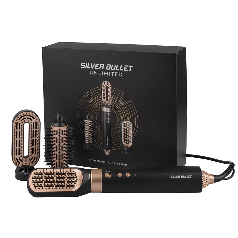 Next day hair? No problem. Get ready for faster, easier, better touch-ups with Silver Bullet Unlimited Hot Air Brush. Best for dry hair, this clever hot air brush is perfectly evolved to easily smooth or add soft waves. With a variety of brush attachments, including hot tube for creating movement, vent for fast drying and styling, and paddle for smoothing, you will enjoy unlimited styling choices. Tangle-free bristles, 3 heat/2 speed settings and a long-life DC motor let you smooth slept on hair, create going out hair or freshen up your style… quickly and easily!
