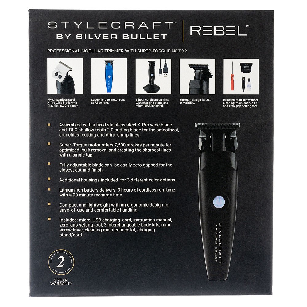 StyleCraft by Silver Bullet Rebel Hair Trimmer is all about super-torque and super customisation. Super-torque motor runs at 7,500 RPM for optimised bulk removal and creating the sharpest lines with a single tap. Fixed stainless steel X-Pro wide blade and DLC shallow tooth 2.0 cutting blade for the smoothest, crunchiest cutting and ultra-sharp lines. Fully adjustable blade is easily zero gapped. Skeleton design for 360° of visibility. Lithium battery with 3 hours of cordless runtime. Micro USB rechargeable. Compact and lightweight with an ergonomic design. The best bit? Pink, blue and black interchangeable body kits for ultimate customisation.
