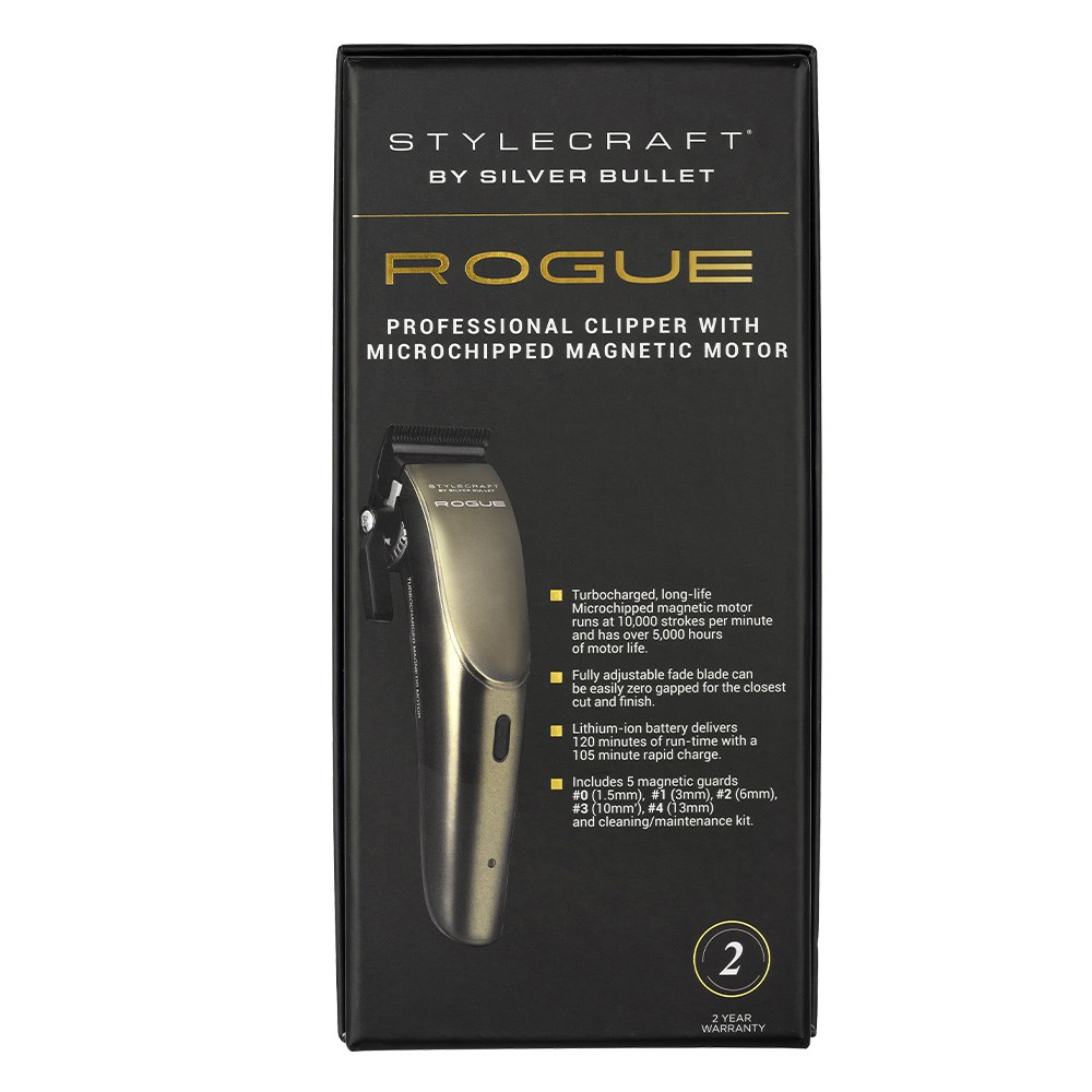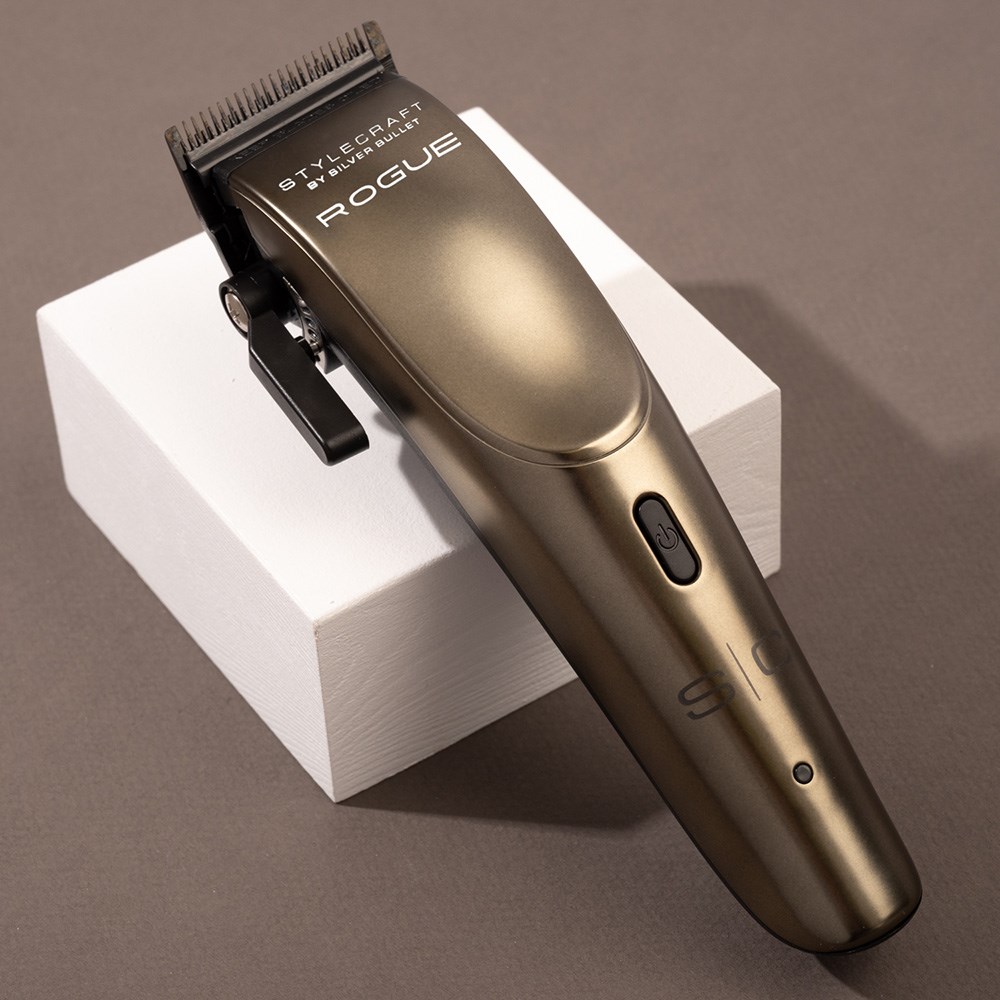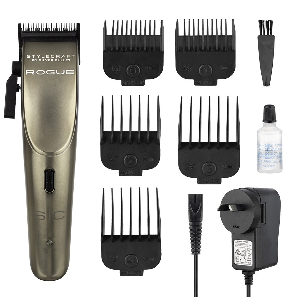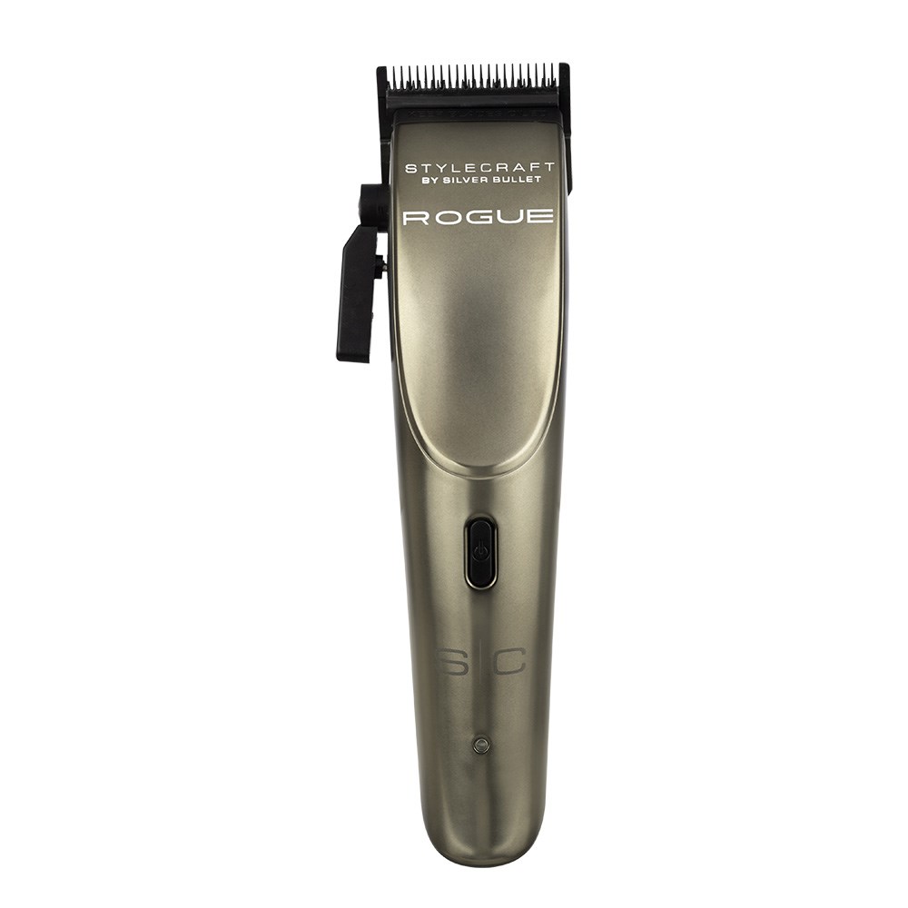 StyleCraft by Silver Bullet Rogue Hair Clipper is a high power, high quality and high performance cordless clipper. The power of a turbocharged, long-life microchipped magnetic motor which runs at 10,000 strokes per minute and has over 5,000 hours of motor life. The quality of a Black Diamond Carbon DLC blade which stays cooler, rust-free and sharper. Fully adjustable fade blade can be easily zero gapped for the closest cut and finish. The performance of a lithium ion battery with 120 minutes of cordless runtime (mains power supply via cord).