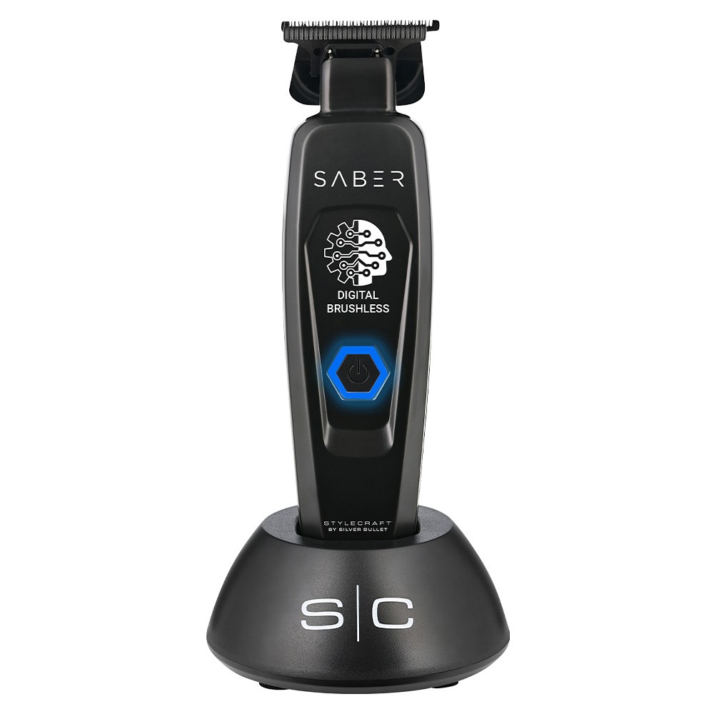 StyleCraft by Silver Bullet Saber Digital Brushless Hair Trimmer Black is a hero trimmer for agility, efficiency and smoothness. Long-life digital brushless motor runs at 7,500 rpm for more efficient power transfer, ensuring smooth operation and heat reduction. Heavy duty, all-metal body with slim design. Black diamond carbon DLC X-Pro wide fixed blade and The One deep tooth moving blade are an unbeatable combo. Fully adjustable zero gap for the closest cut and finish. Skeleton design exposes the blade for superior sightline and improved precision. Lithium-ion battery delivers four hours of cordless runtime with a 90 minute recharge. Universal USB rechargeable.