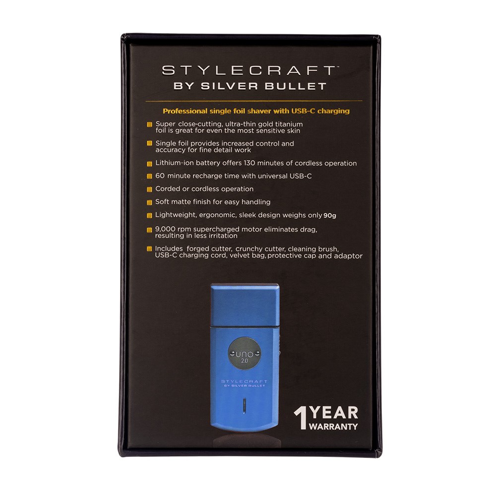 Supercharge your shaving with this incredible, pocket-sized shaver. With a brand new, upgraded design and weighing only 90 grams, StyleCraft by Silver Bullet Uno 2.0 Single Foil Shaver Blue is full of thrilling power. Featuring 9,000RPM supercharged motor which eliminates drag, this shaver achieves a far closer shave. Super-close cutting, ultra-thin hypoallergenic gold titanium foil is ideal for the most sensitive skin. Crunchy blade for guided cutting and forged blade for cutting power. Easy universal USB recharging. Lithium ion battery delivers twice the traditional cordless runtime with an amazing 130 minutes.
