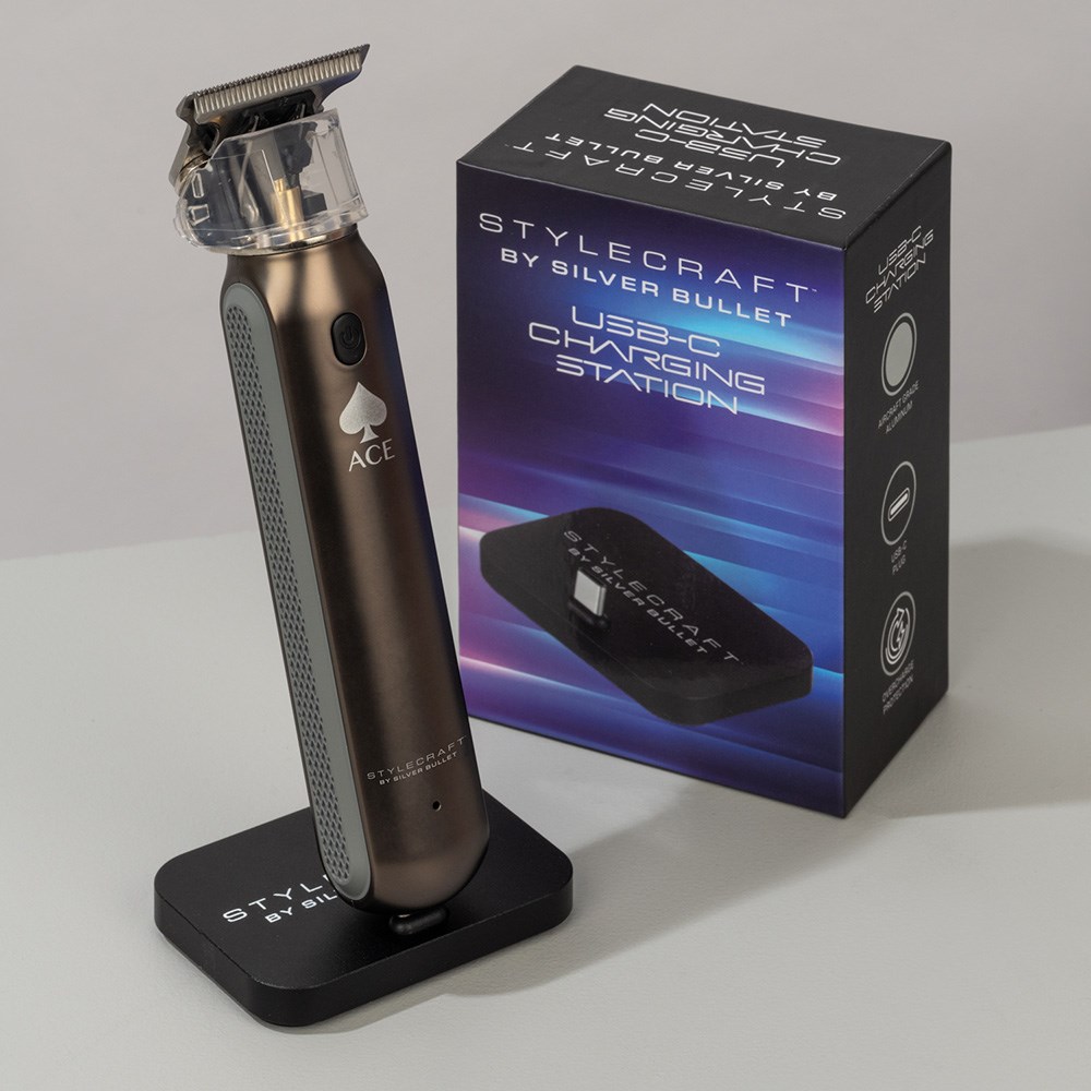 Made from premium, aircraft grade aluminium, StyleCraft by Silver Bullet USB-C Charging Station is a durable essential accessory. This small, sleek charging station is designed for use with StyleCraft by Silver Bullet Heat Stroke, Ace Hair Trimmer and any other USB-C rechargeable devices. Built-in circuit protection prevents damage due to overcharging. Anti-slip base with added silicone pad for enhanced stability. Easy to store and travel-friendly.