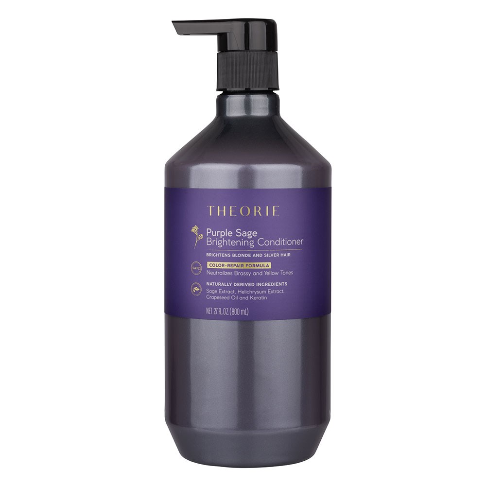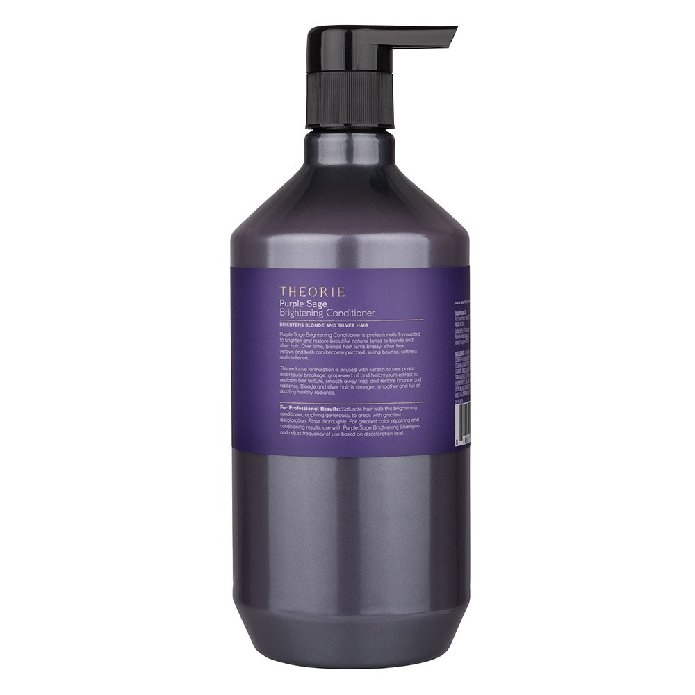 Brighten and restore vibrant blonde and silver hair with the Theorie Purple Sage Brightening Conditioner. Professionally formulated to neutralise brassy and yellow tones. Infused with keratin, sage, helichrysum extract and grapeseed oil, this conditioner seals the cuticle and revitalises hair texture to smooth, reduce frizz and restore natural bounce. Hair is left stronger, smoother and brilliantly radiant.