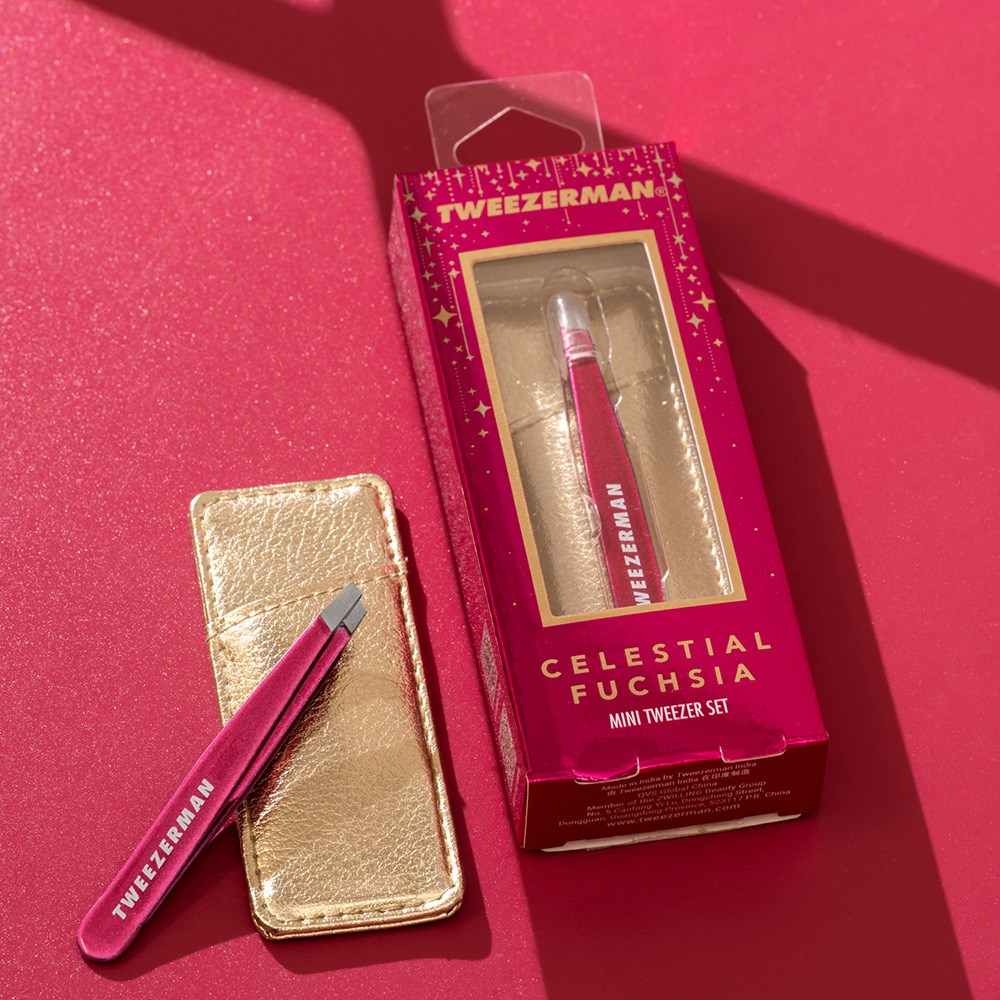 Tweezing made travel friendly. Limited edition Tweezerman Mini Slant Tweezer in Celestial Fuchsia is the perfect gift set for on-the-go touch ups or travel. The Mini Slant Tweezer in fabulous Fuchsia features perfectly aligned, hand-filed tips for precise brow shaping. Superior calibrated tension for comfort, control, and perfect precision. Includes vegan and cruelty-free storage case in gold. From Tweezerman, the beauty tool experts.