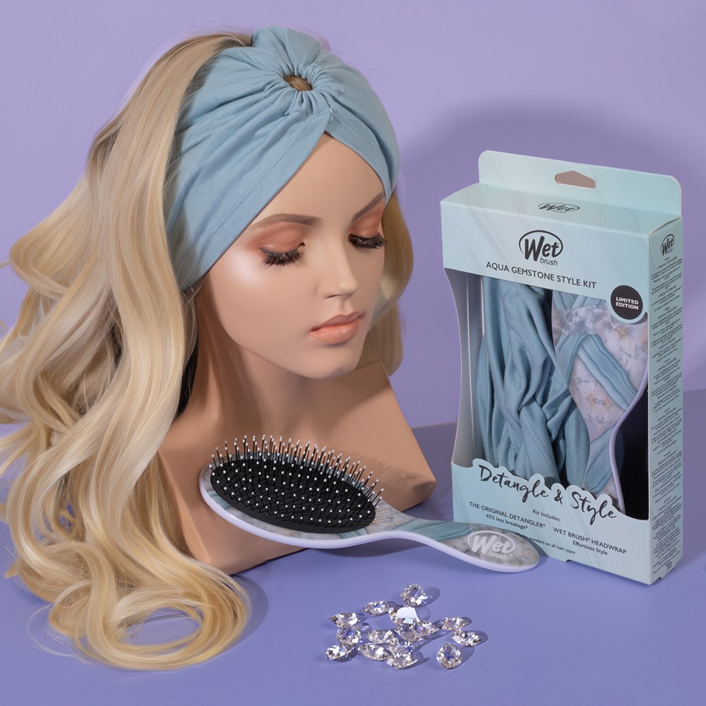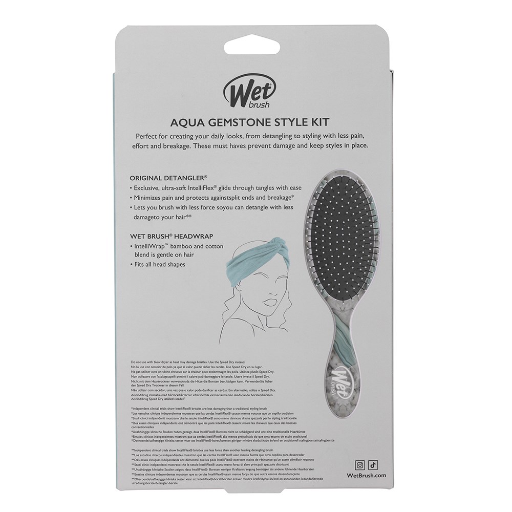 Detangle and style in Aqua Gemstone. This stylish WetBrush Aqua Gemstone Detangle and Style Kit includes the original, award-winning Wet Brush Detangler and a headwrap. The original Detangler’s exclusive, ultra-soft IntelliFlex bristles glide through tangles on all hair types, never pulling or damaging hair. The headwrap’s IntelliWrap bamboo and cotton blend is gentle on hair and fits all head shapes in chic style. In beautiful aqua tones, this kit is a limited edition delight.