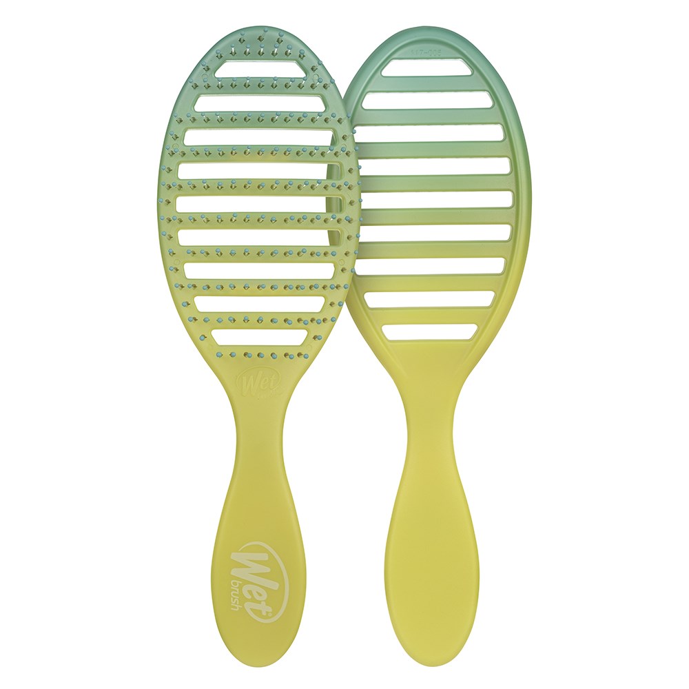 Meet the WetBrush Feel Good Ombre Speed Dry Green. Dry hair without drying it out. The Speed Dry’s vented design speeds up drying time by allowing moisture to escape faster. Heat-resistant Wet Brush HeatFlex bristles gently detangle while blow-drying. Skip the extra heat and avoid damage, helping to keep hair happier. Brush design contours to scalp for extra comfort. Limited edition, ombre hues sure to make you and your hair feel good!