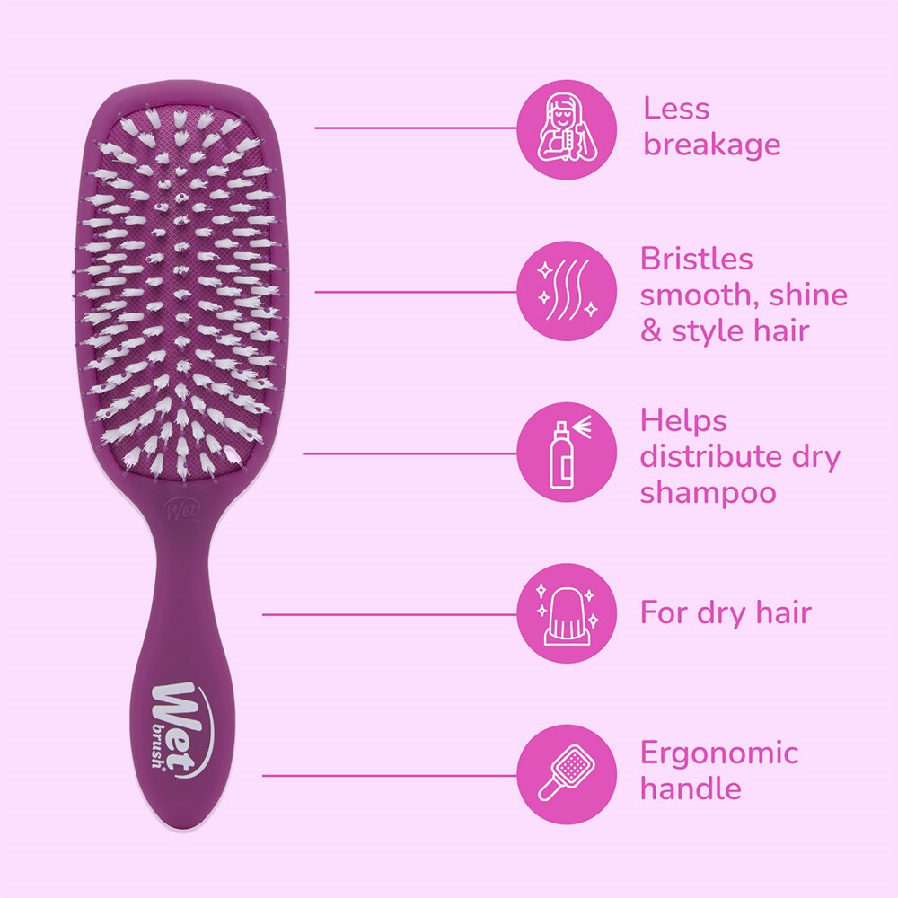 WetBrush Frost Smooth Styler Brush Purple boosts shine while gliding through tangles with ease. This shine-boosting brush leaves hair strong and healthy-looking. Synthetic boar bristles gently loosen knots while spreading hair’s natural oils for shiny strands without pulling or snagging. Exclusive, ultra-soft IntelliFlex bristles minimise effort, breakage and pain. Great for pulled-back styles and distributing dry shampoo.