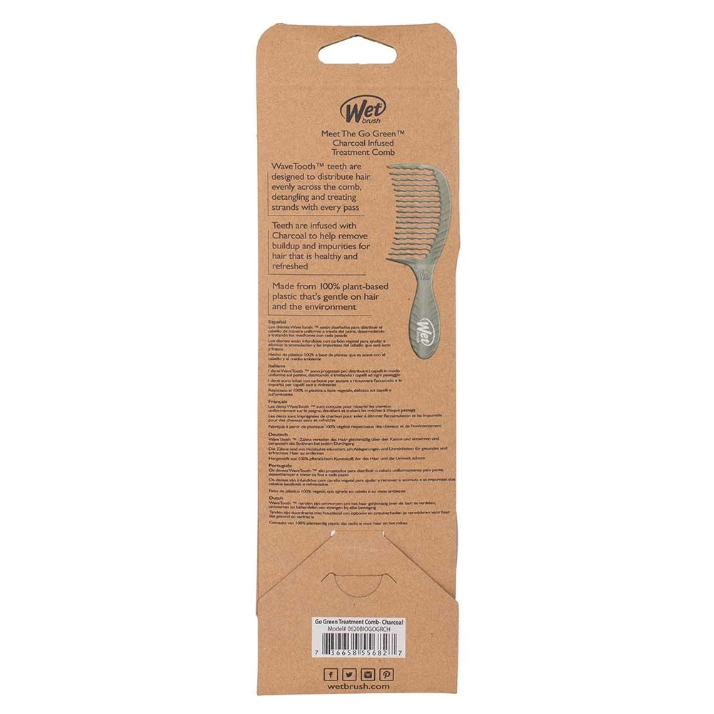 Detangle and purify with the WetBrush Go Green Detangling Comb Grey. This eco-friendly comb gently glides through tangles, while the charcoal-infused teeth remove build-up and impurities. The hair cuticle is left refreshed and renewed, touchably soft and shiny. Crafted with plant-based plastic, this clever Wet Brush comb features a unique WaveTooth design to distribute hair evenly across the comb, detangling and treating strands with every pass. Great for distributing conditioners and hair masks through hair.