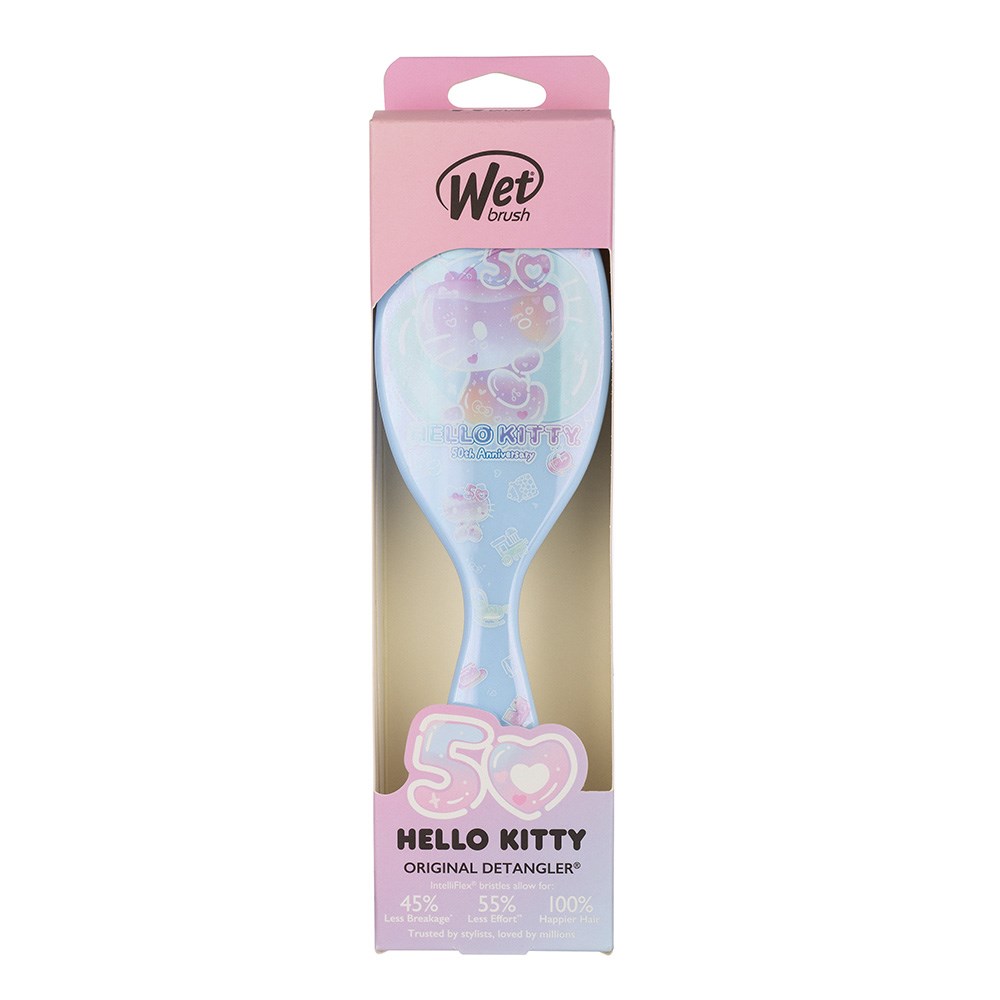 Celebrate Hello Kitty’s 50th birthday with the original, award-winning detangling brush! WetBrush Hello Kitty 50th Birthday Detangler Blue gently loosens knots on wet or dry hair without pulling or snagging. The moment you use it, you’ll feel the difference and never want to try another detangling brush again. Exclusive, ultra-soft Wet Brush IntelliFlex bristles glide through tangles on all hair types with ease. Minimise pain and protect against split ends and breakage. Brush with less force so you can detangle with less damage to hair. A super special Hello Kitty birthday edition!