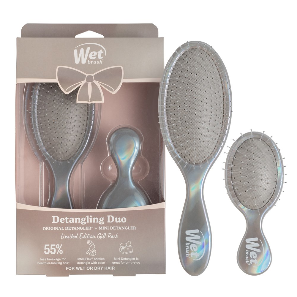 Detangling at home and on-the-go in a holographic dream. This limited edition WetBrush Holographic Detangler Kit Chrome includes the Original Detangler and a Mini Detangler. The world-famous, ultra-soft IntelliFlex bristles glide through tangles on all hair types with ease. The mini size is perfect for on-the-go. The moment you use it, you’ll feel the difference and never want to try another hairbrush again. Add some shine to your day with this limited edition Duo Kit.