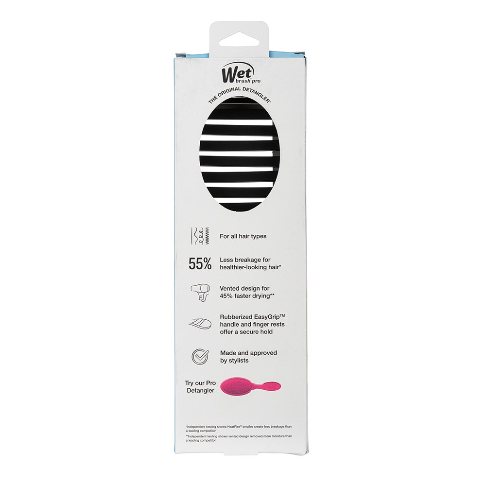 Stylists’ fave way to faster hair drying. WetBrush Pro Frost Flex Dry Paddle Detangler Black features a flexible vented paddle design to speed up dry time while contouring to the scalp for comfort. HeatFlex bristles are heat resistant and safe to use with a blow-dryer. OmniFlex brush head flexes in every direction to contour to scalp. This hair brush has a 20% larger surface area for faster styling.