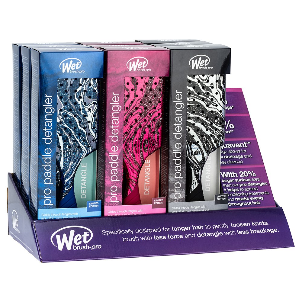 Redesigned by stylists for stylists. This WetBrush Pro Mineral Sparkle Paddle Detangler Display 9pc is adorned in a shimmering and sparkly design. Featuring IntelliFlex bristles for easy detangling, rubberised EasyGrip handle for more comfort and control and an ergonomically advanced design. This display box is a perfect collection for anyone.