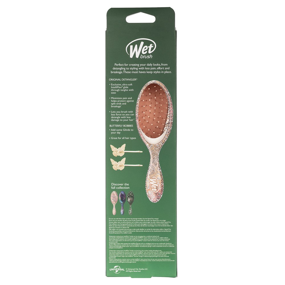 Defy tangles with the limited edition WetBrush Wicked Glinda Detangling Kit. Perfect for creating your daily looks, including detangling and styling, with less pain, effort and breakage. This Wet Brush kit includes the world famous Original Detangler with a Glinda inspired print, as well as two Butterfly Bobbies. 100% happier hair with the Original Detangler featuring exclusive IntelliFlex bristles, while the Butterfly Bobbies add some Glinda to your day.