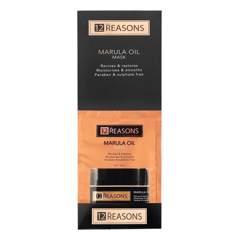 Encourage add-on sales with 12Reasons Marula Oil Hair Treatment 12pc Display. Excellent for countertops, the display houses 12 x 50ml sachets. 12Reasons Marula Oil Hair Treatment intensely hydrates and smooths dry, frizzy hair. Richly nourishing, hair is left smooth, silky and feeling luxurious. Rich fruit and seed oils add shine and softness. 12Reasons Marula Oil Hair Treatment brings smoothness back to frizzy hair in only seven minutes!