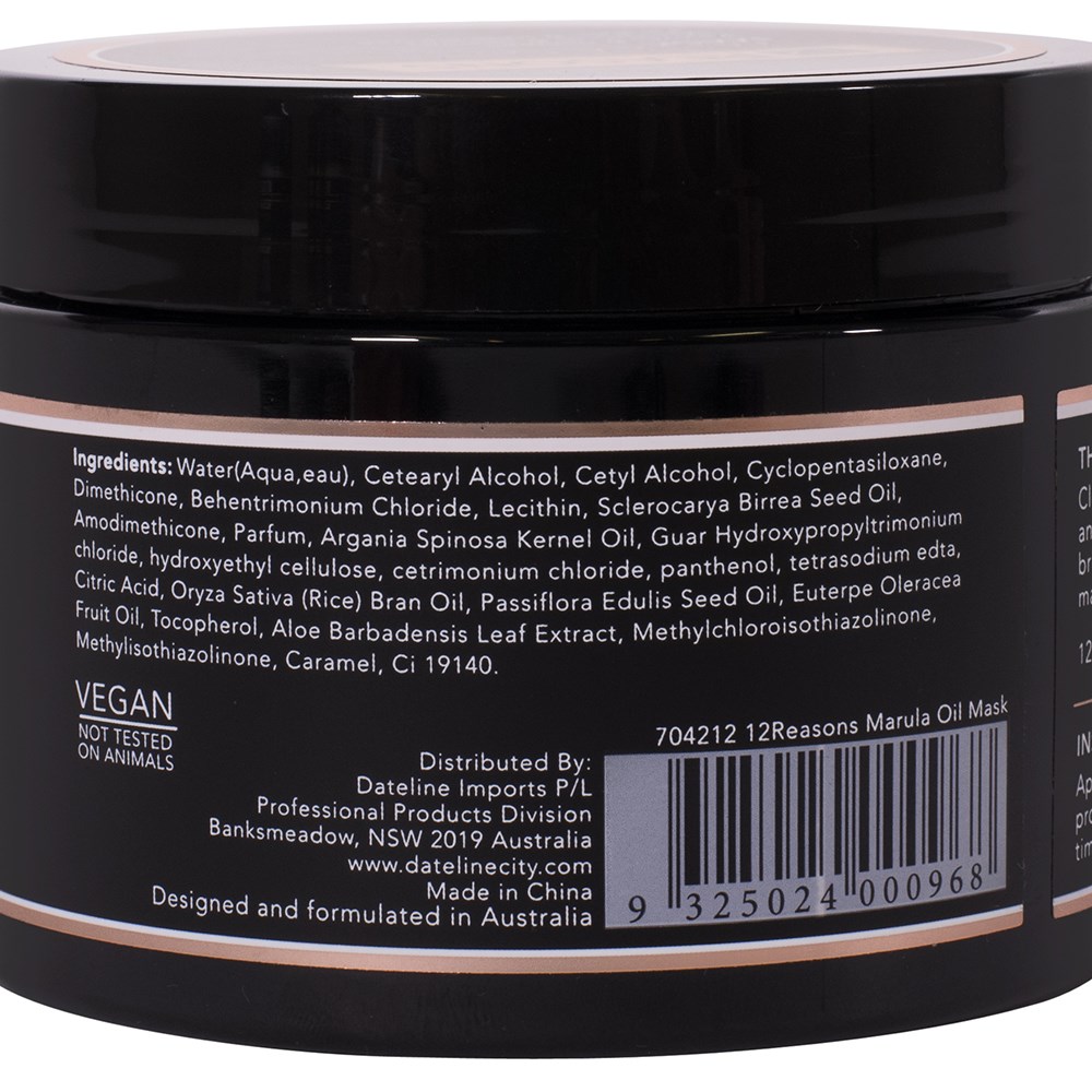 12Reasons Marula Oil Hair Mask intensely hydrates and smooths dry, frizzy hair. Richly nourishing, hair is left smooth, silky and feeling luxurious. Rich Fruit and Seed Oil add shine and softness. Use with 12Reasons Marula Oil Shampoo, Conditioner and Serum.