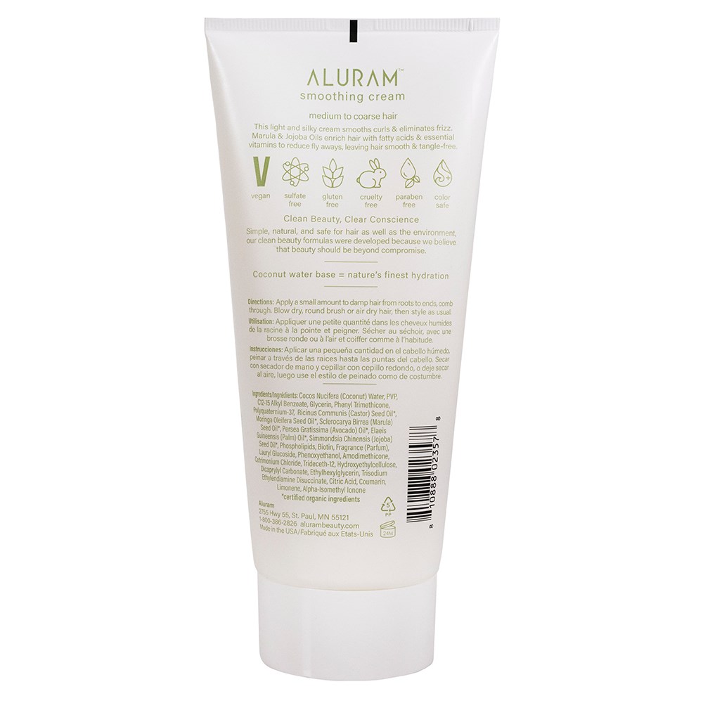 Clean beauty with a clear conscience. Free of formulas which are harmful to hair and the environment. With a powerfully plant-driven formulation started in a base of hydration-rich Coconut Water, Aluram Smoothing Cream is infused with nourishing Marula Oil for a light, silky cream which smooths curls and eliminates frizz. Vegan, sulphate free, gluten free, paraben free and colour safe. Made in the USA.