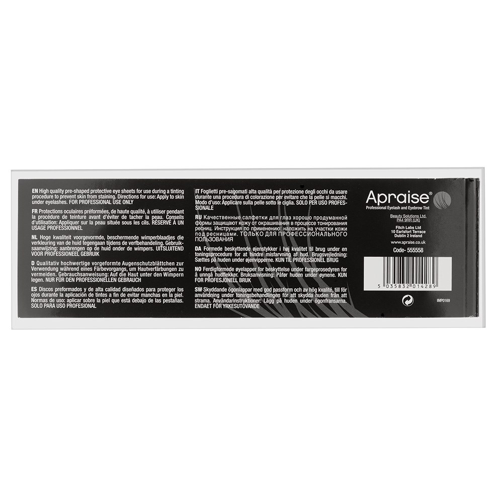 Apraise Eyelash Tinting Protective Sheets are high quality, pre-shaped protective eye sheets. Prevent skin from staining during eyelash tinting procedures. Includes 96 sheets. Made in the UK.