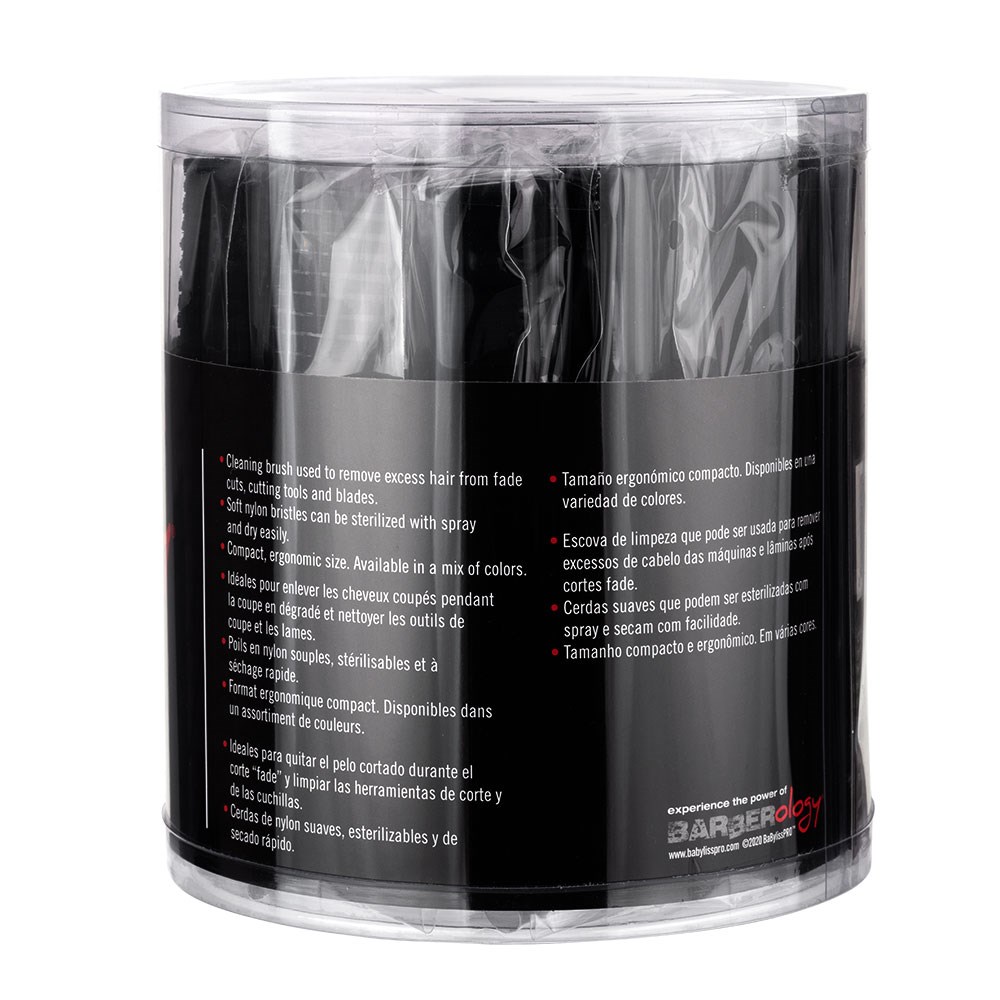 BaBylissPRO Barberology Fade and Blade Cleaning Brushes 18pc Black is ideal for removing excess hair from fade cuts, cutting tools and blades. Soft nylon bristles and a compact, ergonomic design for the left or right hand. Can be sterilised with spray and dried easily.