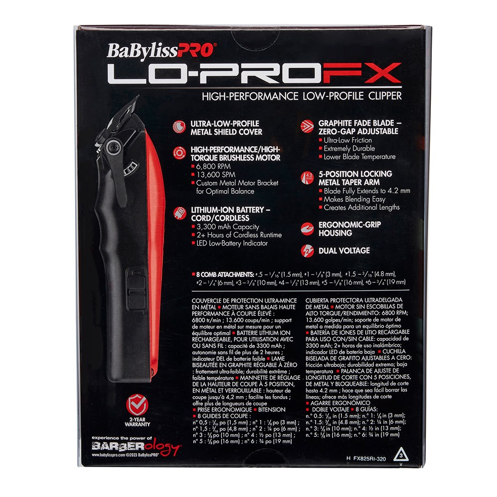 With 25+ years of barbering under his belt, Van Campbell goes by @VanDaGoat on Instagram with good reason. His G.O.A.T. mentality is evident in his dedication to his craft. BaBylissPRO LoPROFX Hair Clipper in Red is limited edition, high performance and ultra-low profile. With red housing, this intuitive, ergonomic tool features a high torque 6800 RPM brushless motor. 3300 mAh lithium ion battery with 2+ hours of cordless runtime. Five position locking metal taper arm extends blade to 4.2mm for easy blending. Graphite fade blade is zero gap adjustable, low friction, extremely durable with a lower blade temperature.
