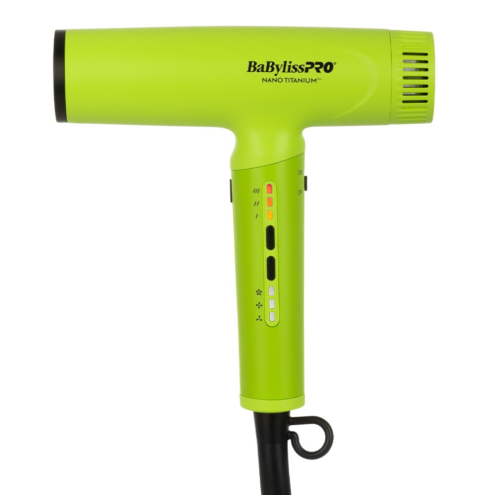 Good things truly do come in small packages! BaBylissPRO Nano Titanium Light Iconic Hair Dryer Green is compact, super-lightweight and high speed. Engineered airflow for faster drying. Ideally balanced T-shaped design weighs less than 453g and is almost the size of a smartphone. 1,400 watts of power and 9 digital heat/speed settings for versatile styling. Nano Titanium and ionic technologies deliver maximum smoothness and shine. Dual voltage for worldwide usage. Three innovative attachments meet every styling demand: cool-to-touch concentrator nozzle with air gaps for faster cooling, contoured diffuser and straightening comb with curved teeth for superior tension during styling.