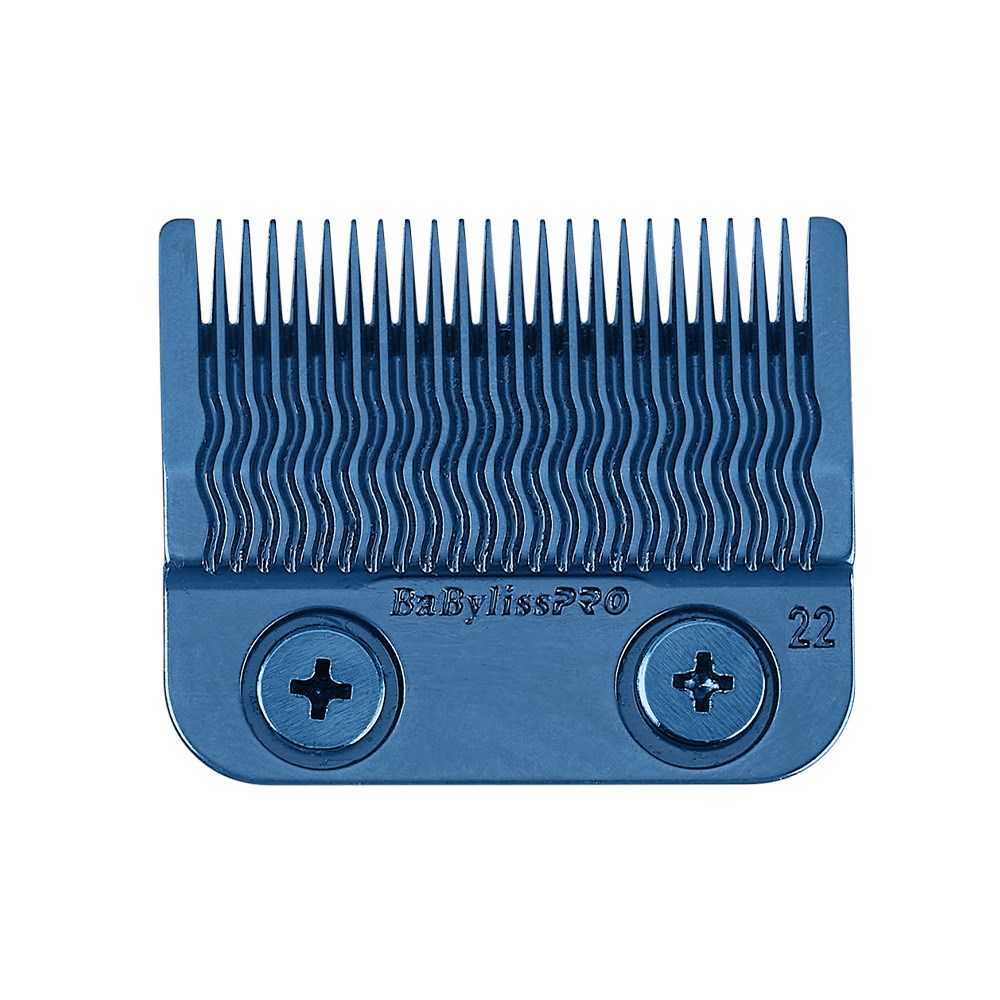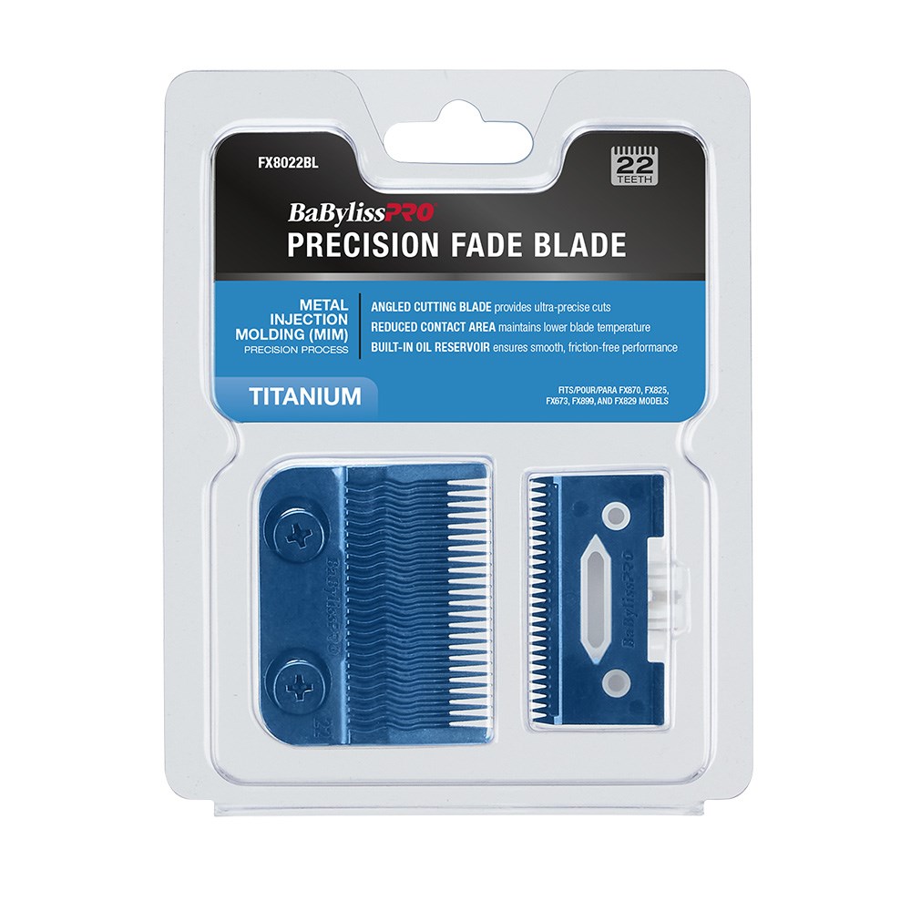 Longer lasting. Greater precision. Improved performance. BaBylissPRO Replacement Clipper Blue Titanium MIM Fade Blade FX8022BL is an angled cutting blade which provides ultra-precise cuts. This replacement blade fits BaByliss PRO Metal FX Lithium Hair Clippers, Lo-PROFX Hair Clippers, LithiumFX Hair Clipper and FXONE Hair Clippers (including GoldFX, BlackFX and Lo-PROFX). Built-in oil reservoir ensures smooth, friction-free performance. Reduced contact area maintains lower blade temperature.