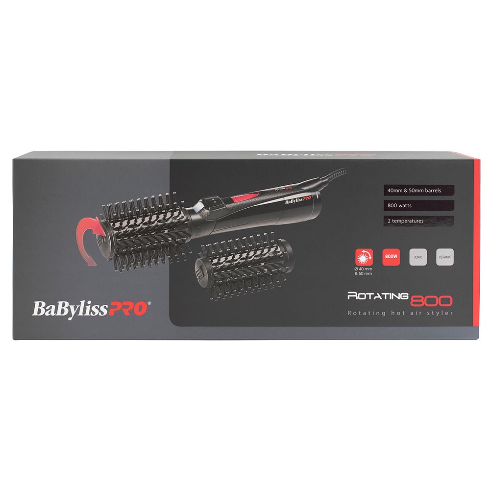 One tool in one hand for the ultimate in fast, easy and quick styling. BaBylissPRO Rotating Hot Air Brush combines hair dryer and rotating brush for gorgeously shiny, smooth and volumised hair in record time. Two different sized barrels, 40 mm and 50 mm, for increased styling options. With 800 watts of power, luscious fullness and body are created. Ionic and ceramic technology reduces frizz and flyaways.