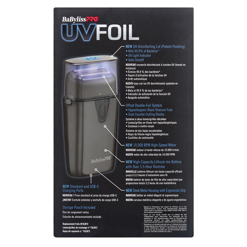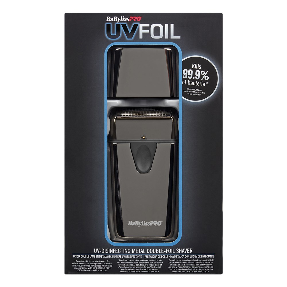 The pioneering BaBylissPRO UVFoil Shaver, the definitive UV-Disinfecting Metal Double Foil Shaver for barbers. Equipped with UV light technology, it kills 99.9% of bacteria*, including E. coli and Staphylococcus aureus. Crafted with a sleek metal housing and ergonomic grip, it ensures a stylish and precise shaving experience. The hypoallergenic double foils and dual counter-cutting blades guarantee a close and irritation-free shave.