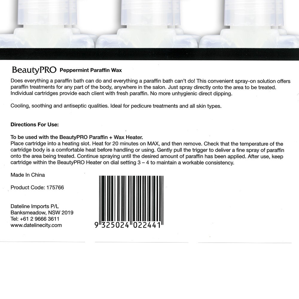 The convenient spray-on paraffin wax solution. No more unhygienic direct dipping. Peppermint provides cooling, soothing and antiseptic qualities, suitable for all skin types. Cartridges slot straight into the BeautyPRO Wax + Paraffin Heater.