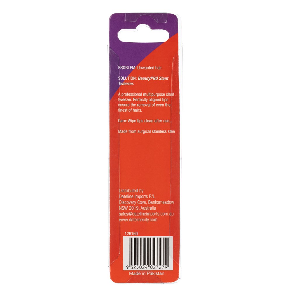 The BeautyPRO Slant Tweezer is a high-quality grooming tool designed to provide precision and control for effortless hair removal. Crafted with durable stainless steel, this tweezer features a perfectly slanted tip that ensures accurate and easy gripping of even the finest hairs. Ideal for shaping eyebrows, removing unwanted facial hair, or performing precise touch-ups, its ergonomic design ensures comfort during use. The BeautyPRO Slant Tweezer is a must-have for beauticians and anyone looking for professional-quality tweezing at home, delivering long-lasting performance with minimal effort.