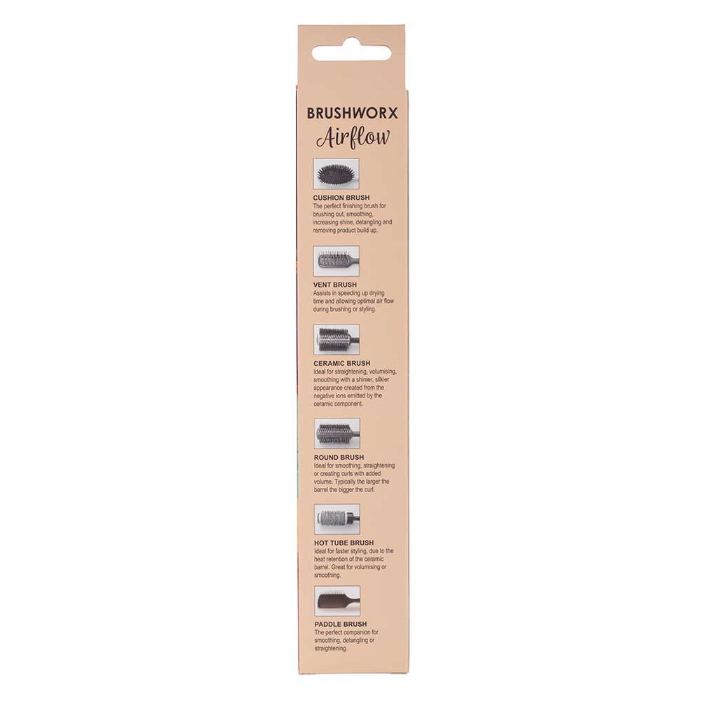 Lightweight, ergonomic and perfect for leave-in styling. Brushworx Airflow Hot Tube Hair Brush Medium is a blow-dry staple. All Brushworx Airflow hair brushes feature a vented effect for accelerated blow-drying time. Enjoy faster styling courtesy of the ceramic barrel’s heat retention. Ideal for all styles of blow-drying, this brush is most loved for volume, waves and soft curls. Nylon bristles grip and create the perfect amount of tension for impeccable styling. Silkier, shinier, smoother results… faster. Brushworx, the brush authority.