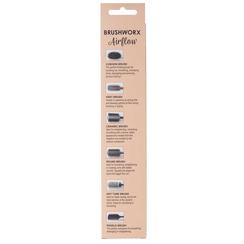 Lightweight, ergonomic and perfect for ultra-fast styling. Brushworx Airflow Long Barrel Hot Tube Hair Brush Large is a blow-dry staple. All Brushworx Airflow hair brushes feature a vented effect for accelerated blow-drying time. Featuring a longer barrel than a typical hot tube brush, this brush is amazing at covering more ground when blow-drying for maximum efficiency. Ideal for all styles of blow-drying, this brush is most loved for volume, waves and soft curls. Nylon bristles grip and create the perfect amount of tension for impeccable styling. Silkier, shinier, smoother results… faster. Brushworx, the brush authority.