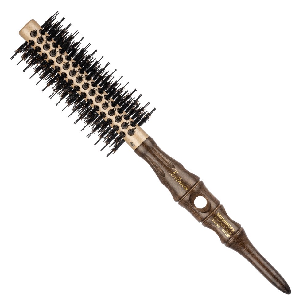 The ionic and ergonomic companion to every blow-dry. Brushworx Botanix Radial Hair Brush is an ionic ceramic styling brush with the perfect blend of nylon and boar bristles. Amp up shine and silkiness with the advantage of negative ions emitted by ceramic. Fantastic for smoothing, adding luscious volume or a wavy finish, this brush is part of a range of radial styling brushes designed to ensure all your styling needs are effortlessly met. An ergonomic handle allows for the most comfortable grip. Bonus: the pick handle shape makes for easy peasy sectioning.