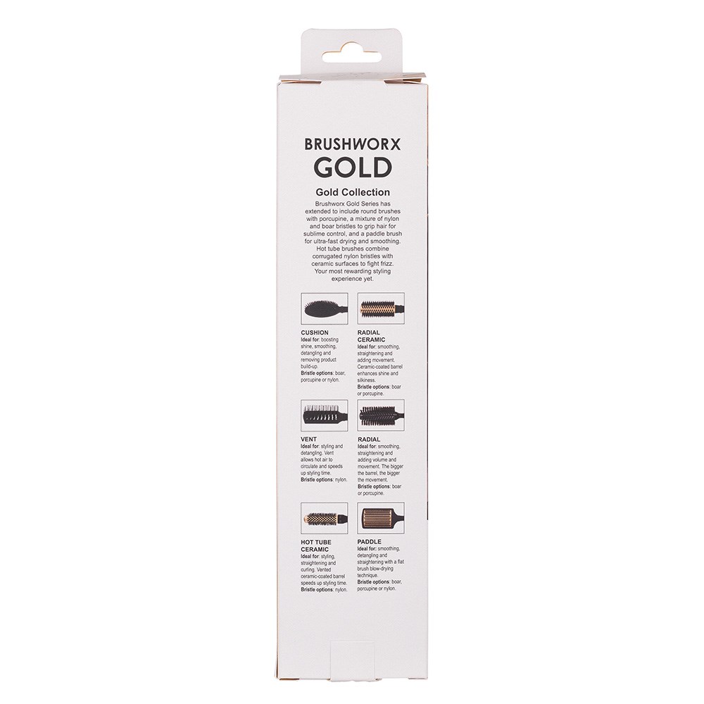 Brushworx Gold Ceramic Hot Tube Hair Brushes feature corrugated nylon bristles; a first for Brushworx! Tiny ripples allow the nylon bristles to grip and control the hair. Brushworx Gold Ceramic Hot Tube Brushes are ideal for thick, coarse, stubborn and hard to manage hair types. Brushworx Gold Ceramic Hot Tube Brushes also feature ceramic barrels to fight frizz for a smooth, shiny finish.